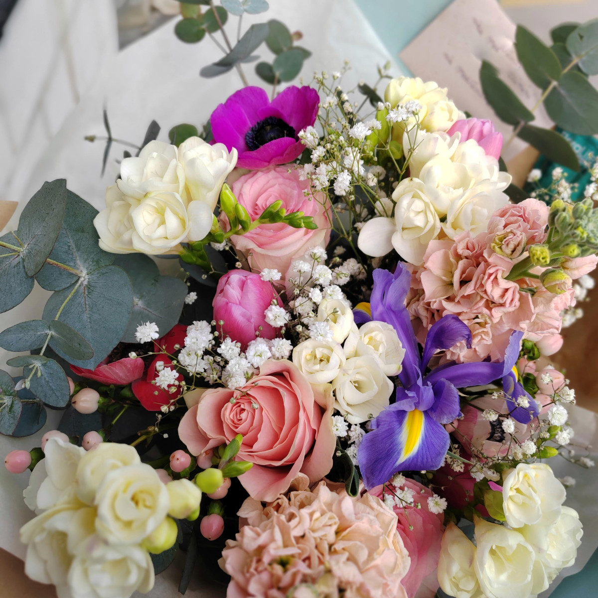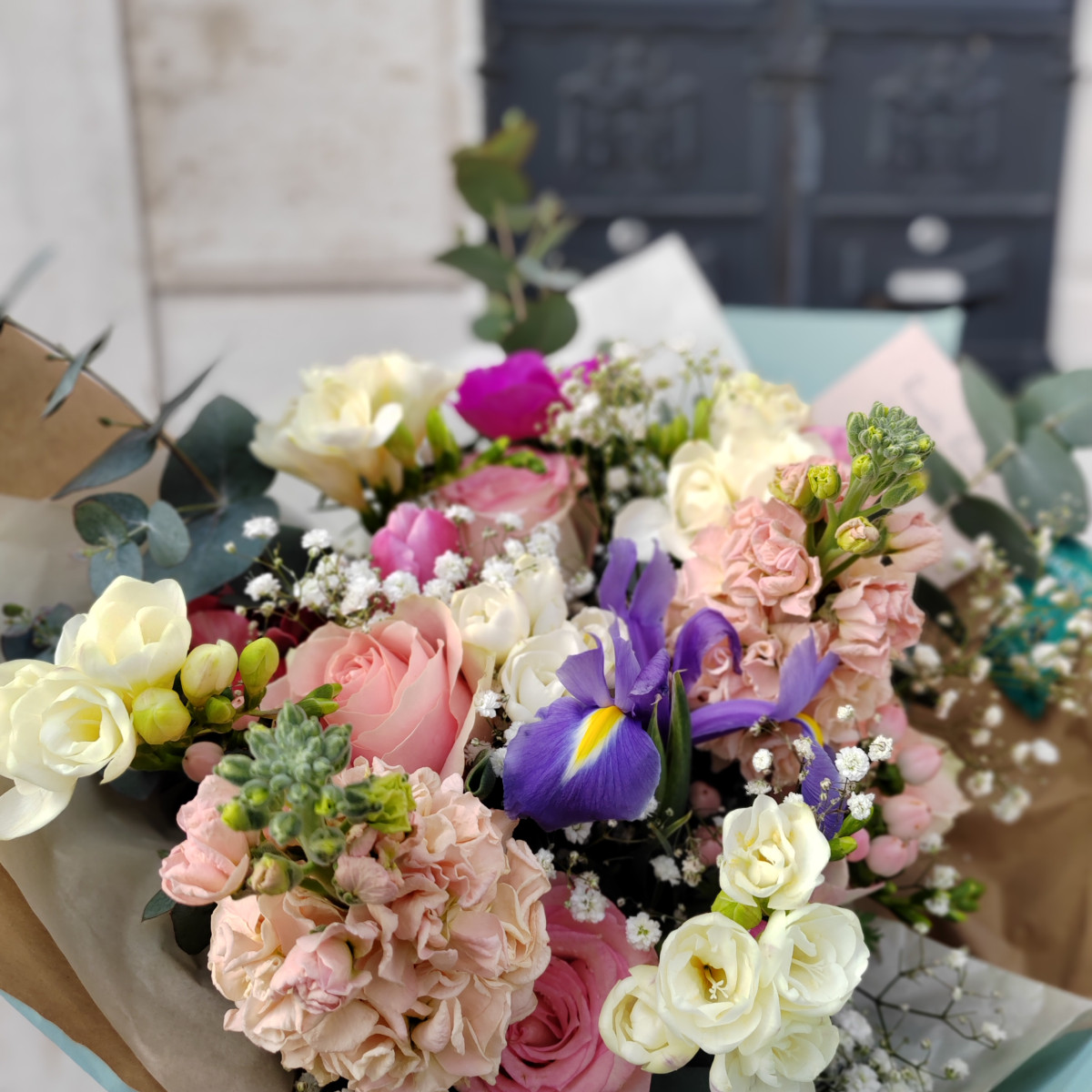 Splendido bouquet realizzato con fiori particolari ed accostamenti cromatici delicati (che potrebbero differire dalla foto per colore in base alle disponibilità) e confezionato in modo elegante in confezione color carta da zucchero .