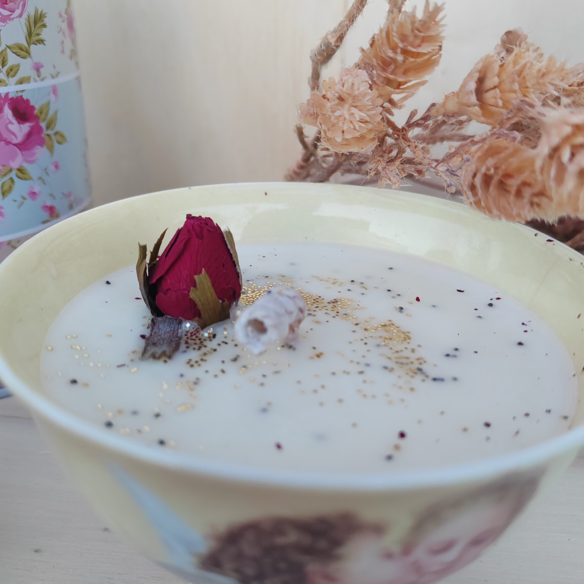 Realizzata in cera di soia 100% bio, una cera vegetale, biodegradabile e senza fumi tossici. Garantisce una combustione lenta e pulita. La candela è creata artigianalmente, colando a mano la cera nella tazza decorandola con preziosi elementi che la rendono ancor più deliziosa alle vista.