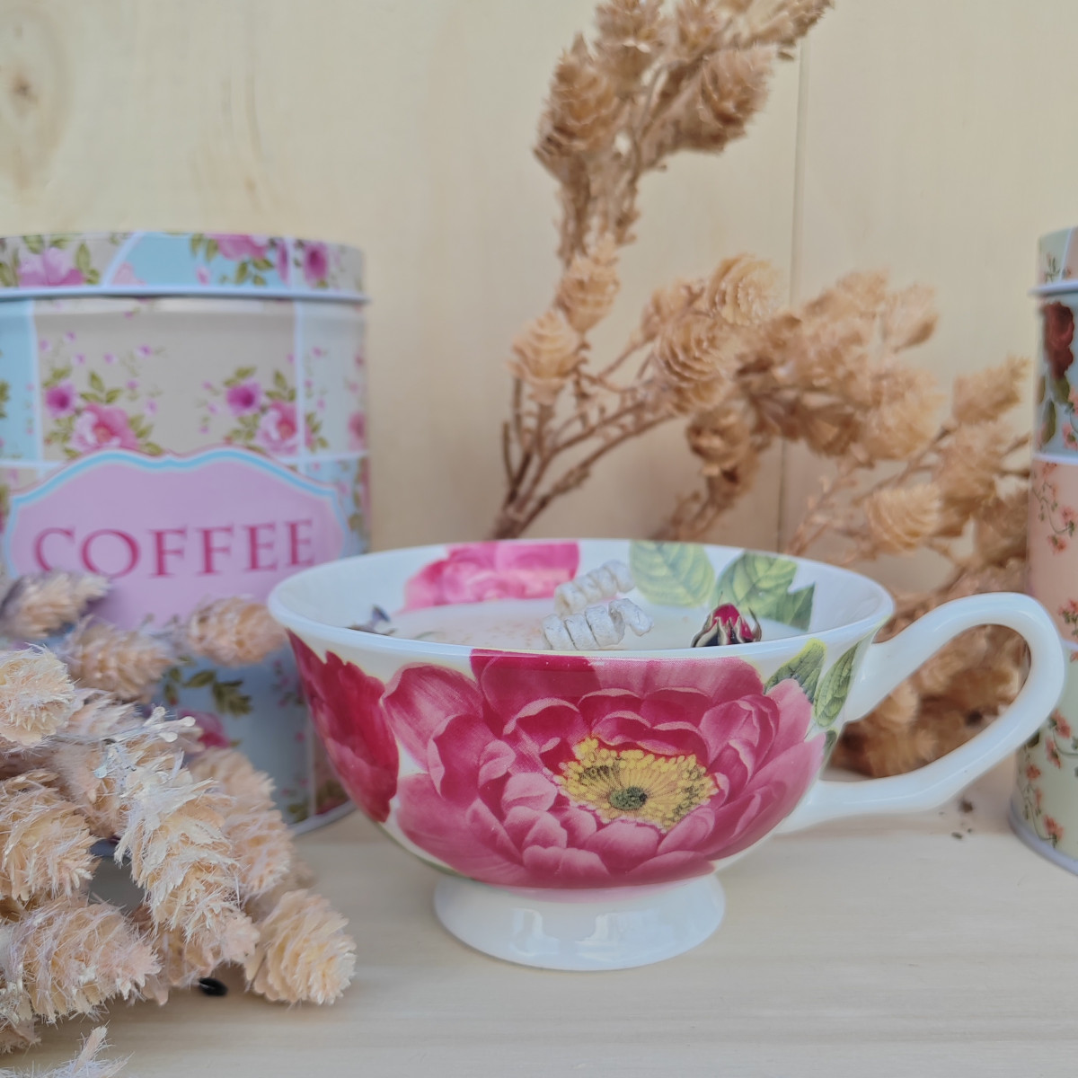 L’anima della candela: ogni pezzo è unico, realizzato recuperando autentiche tazze inglesi in porcellana.