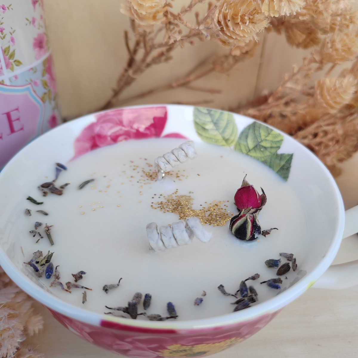 Realizzata in cera di soia 100% bio, una cera vegetale, biodegradabile e senza fumi tossici. Garantisce una combustione lenta e pulita. La candela è creata artigianalmente, colando a mano la cera nella tazza decorandola con preziosi elementi che la rendono ancor più deliziosa alle vista.