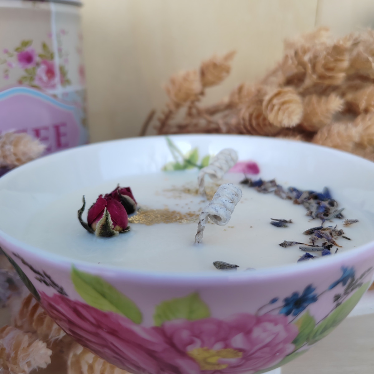 Realizzata in cera di soia 100% bio, una cera vegetale, biodegradabile e senza fumi tossici. Garantisce una combustione lenta e pulita. La candela è creata artigianalmente, colando a mano la cera nella tazza decorandola con preziosi elementi che la rendono ancor più deliziosa alle vista.