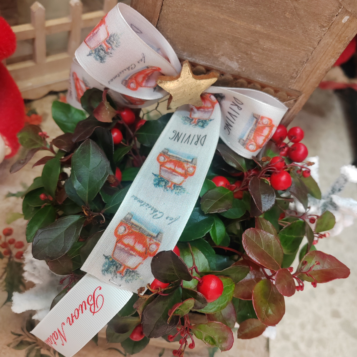 Casina in legno con scritta “Colorful Winter”, nastrino colorato “driving home for Christmas” con macchinina rossa e scritta buon natale.