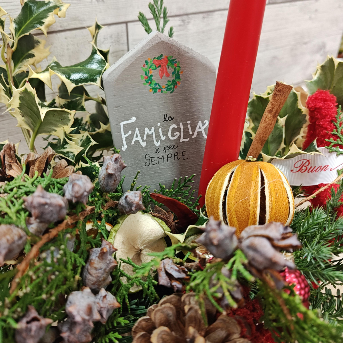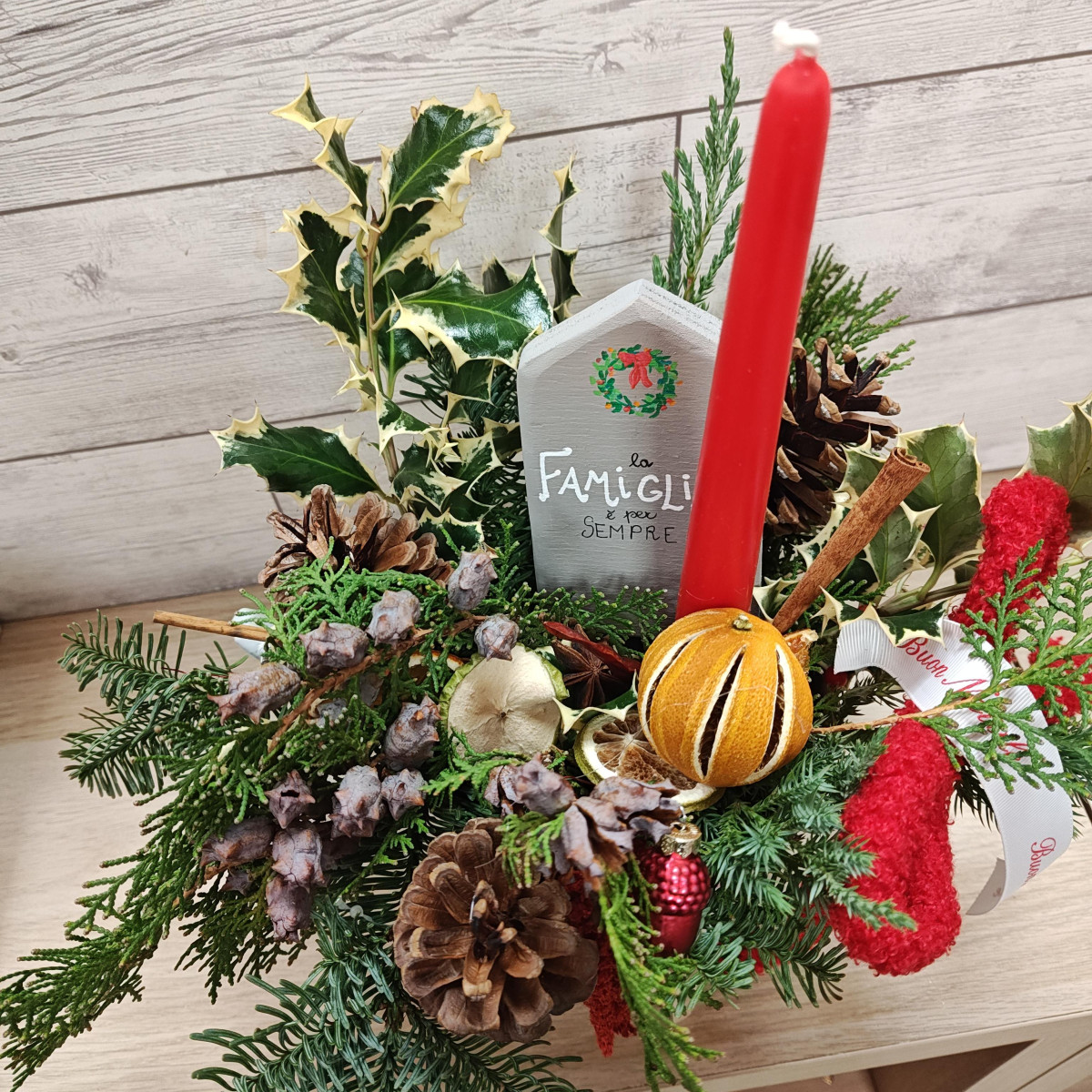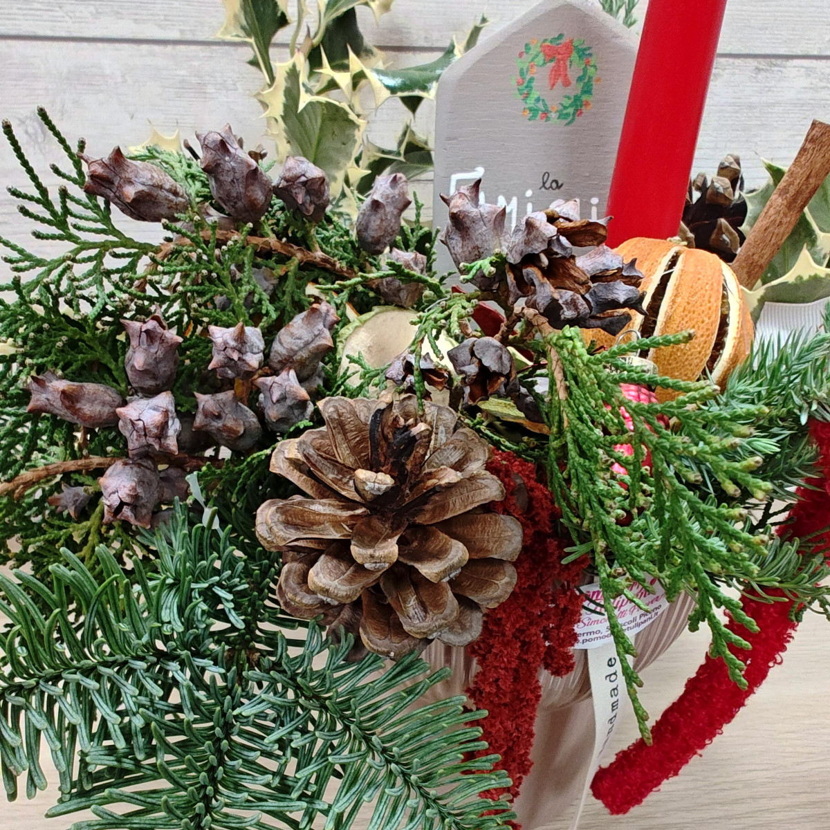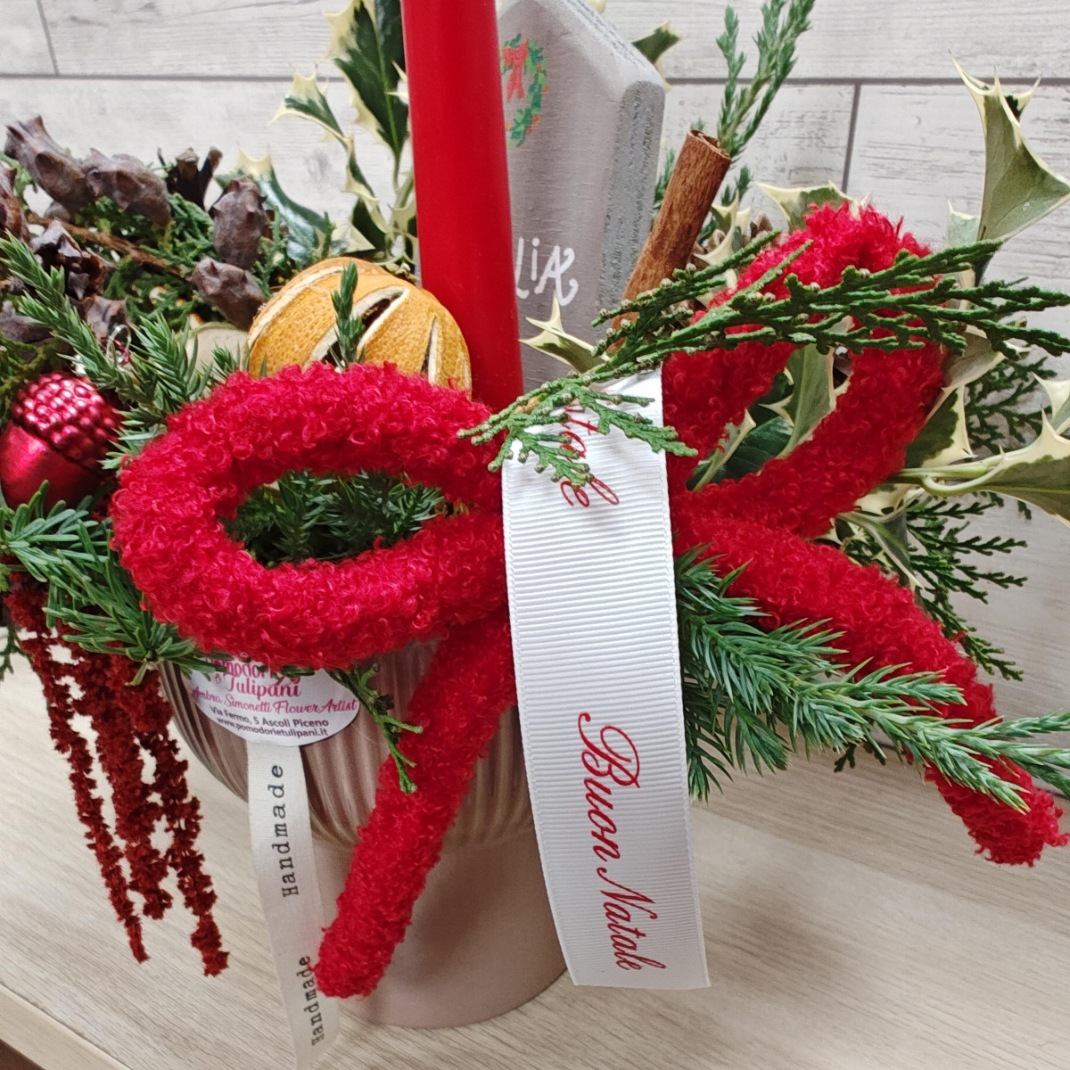 Centrotavola realizzato su vaso in ceramica con vari elementi ornamentali naturali e nastro peluche, con casina handmade con frase sulla famiglia