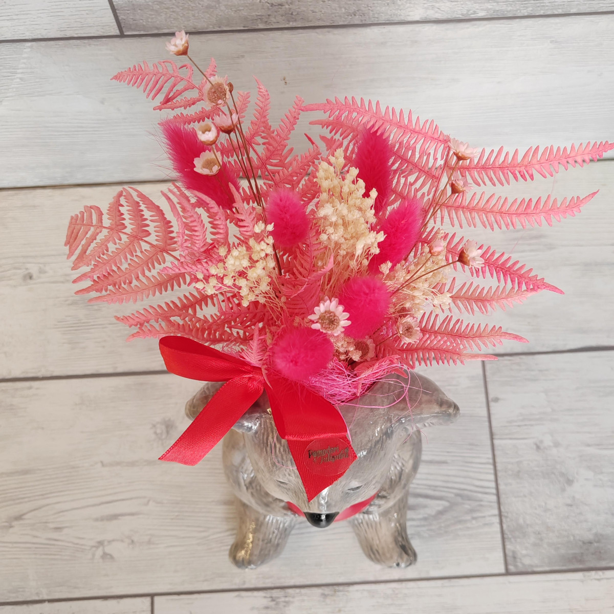 Tenera composizione con vaso in coccio a forma di animale e fiori stabilizzati ed essiccati