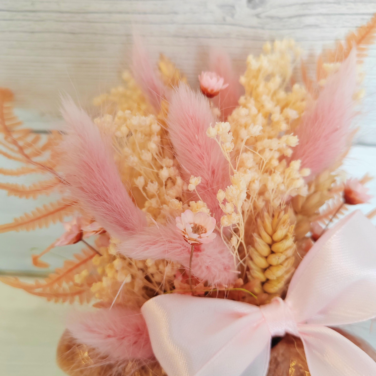 Tenera composizione con vaso in coccio a forma di animale e fiori stabilizzati ed essiccati
