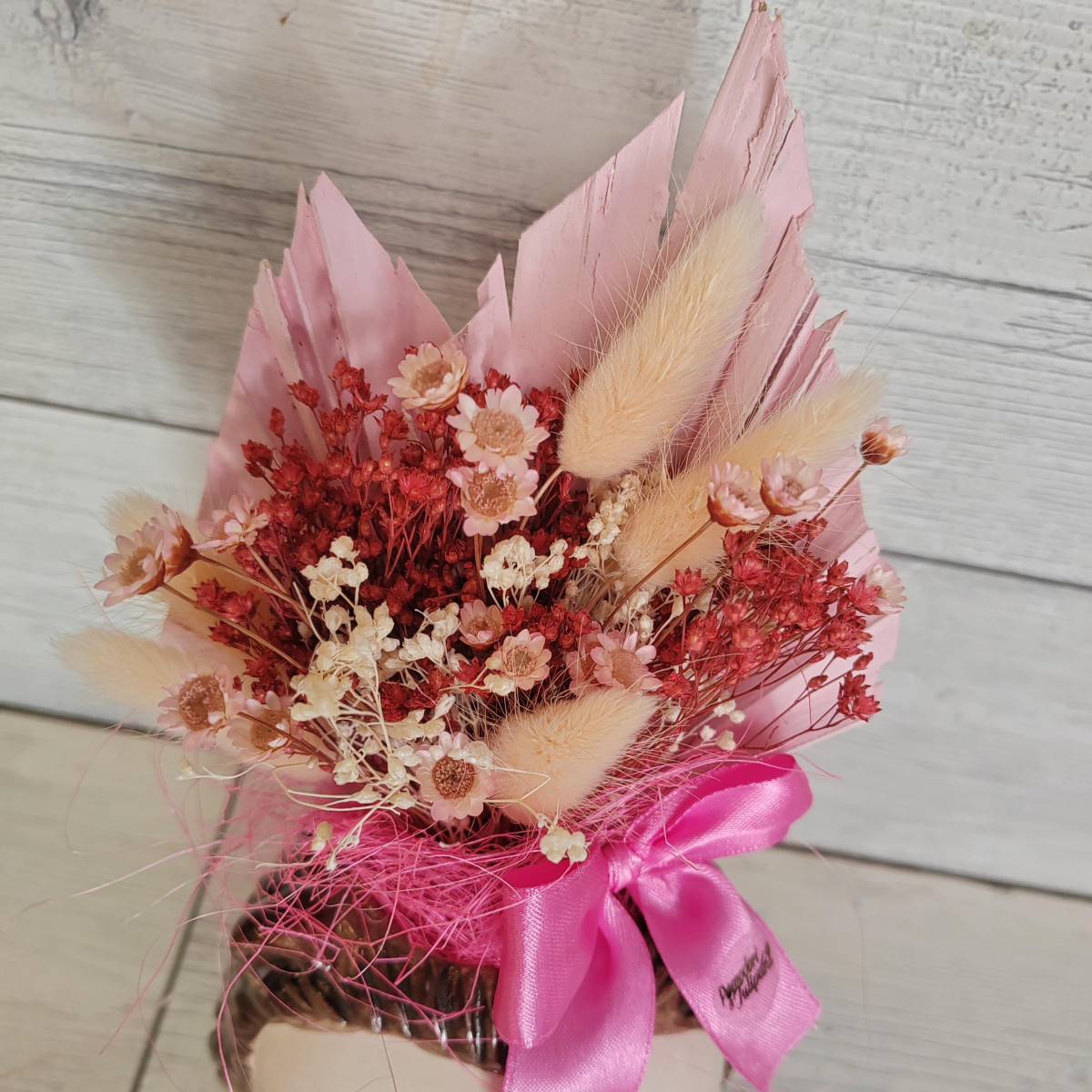 Tenera composizione con vaso in coccio a forma di animale e fiori stabilizzati ed essiccati
