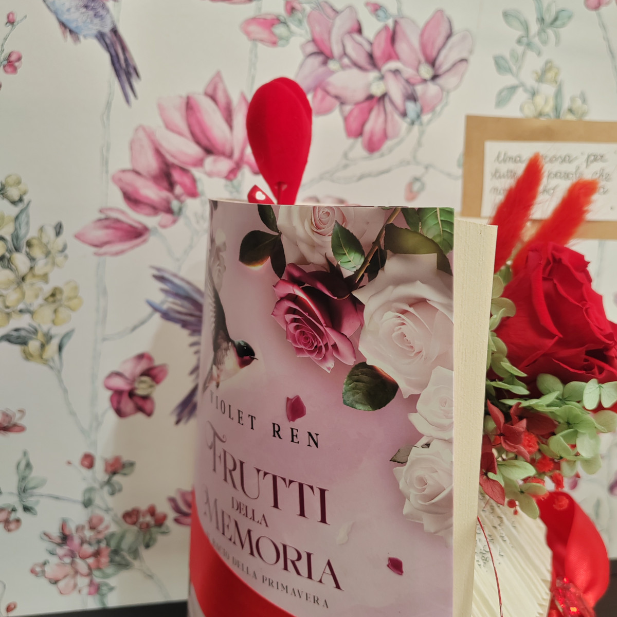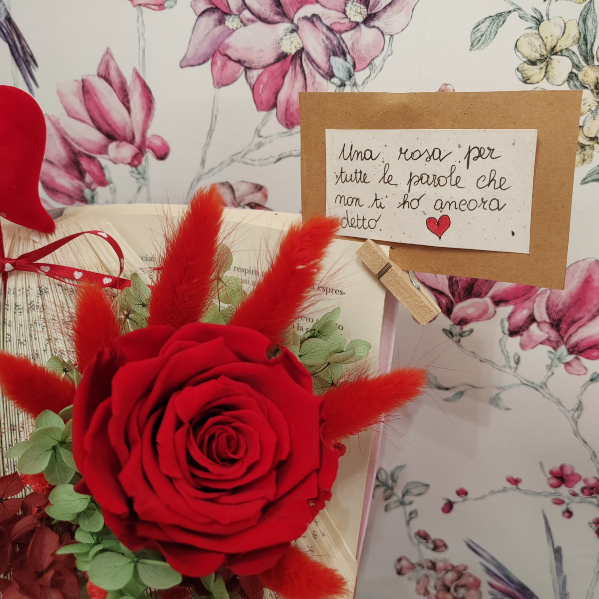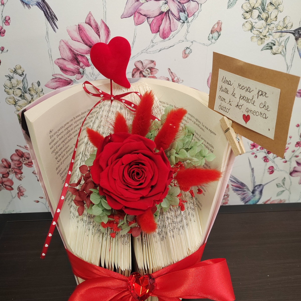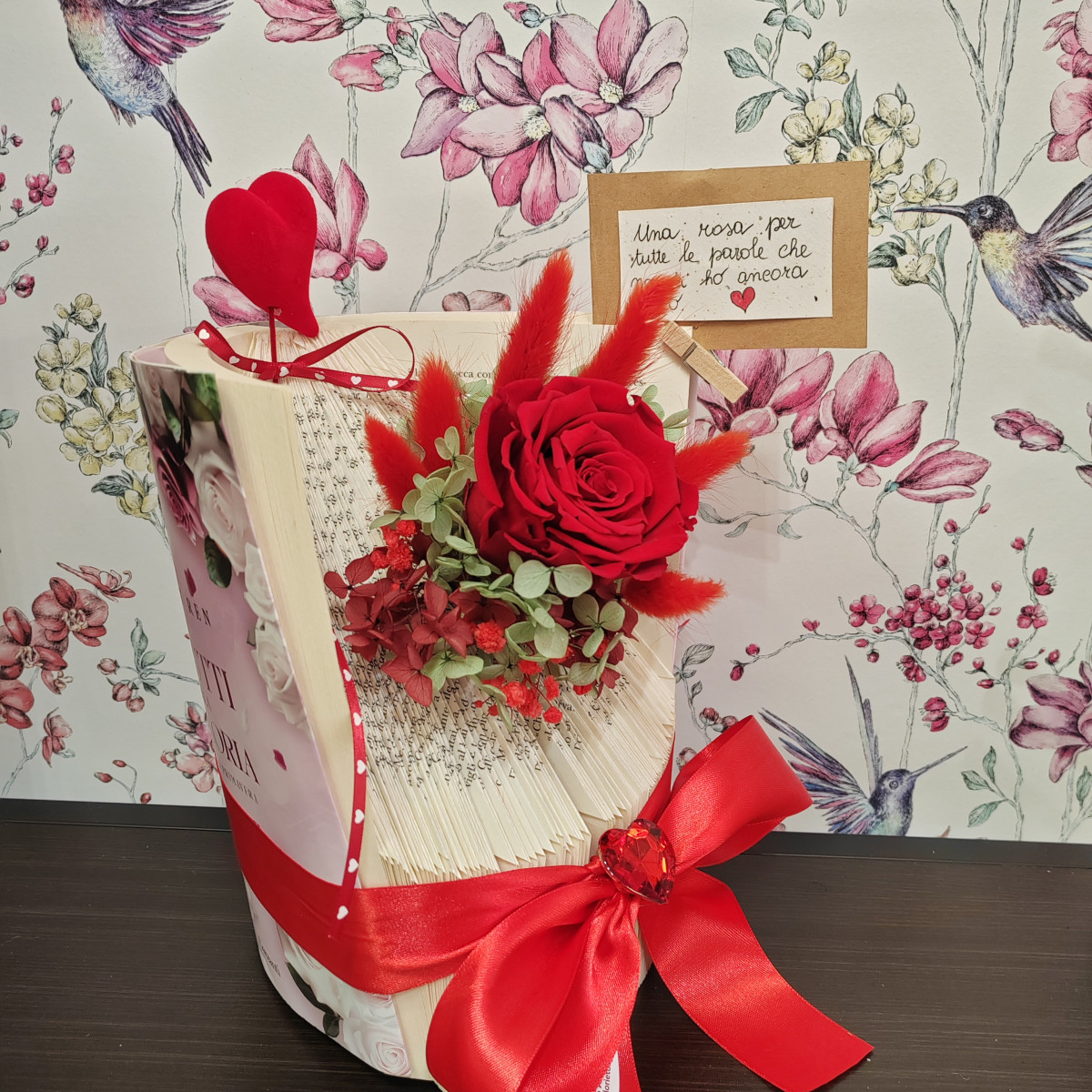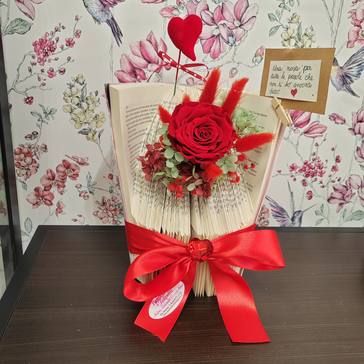 Composizione con rosa e ortensie stabilizzate realizzata artigianalmente piegando le pagine di un vero libro, ancora leggibile.