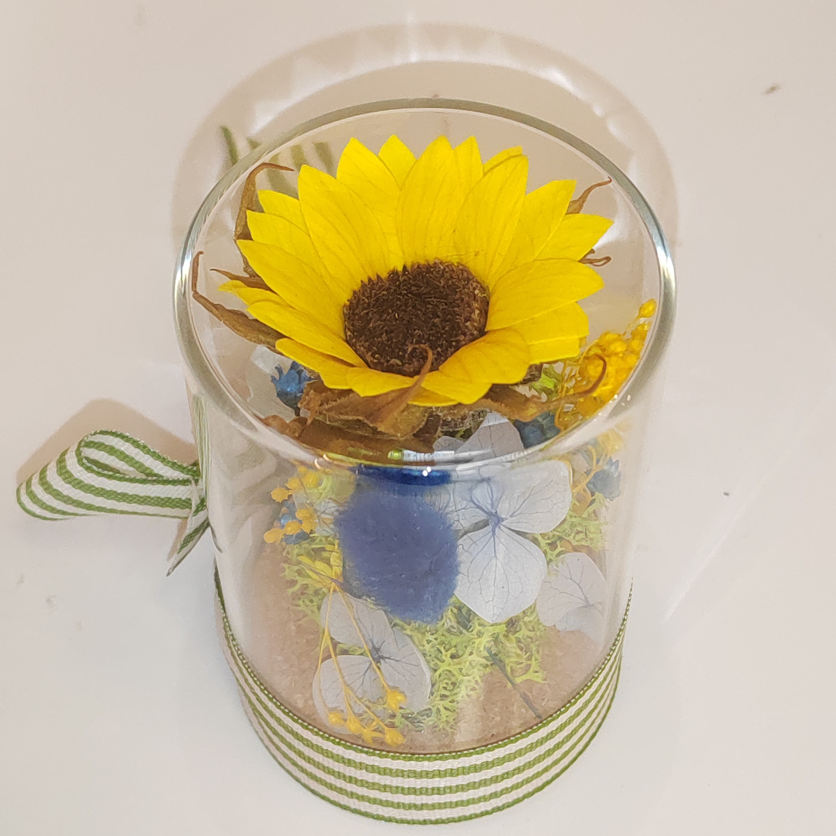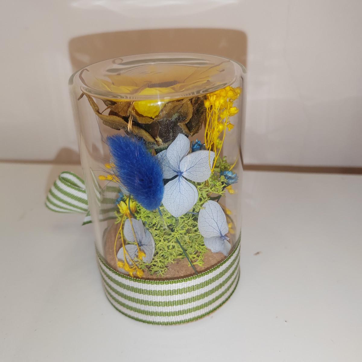 Composizione con girasole mini stabilizzato e altri fiori stabilizzati come glixia, ortensia, muschio nordico, sotto vetro, in barattolo con tappo di sughero.