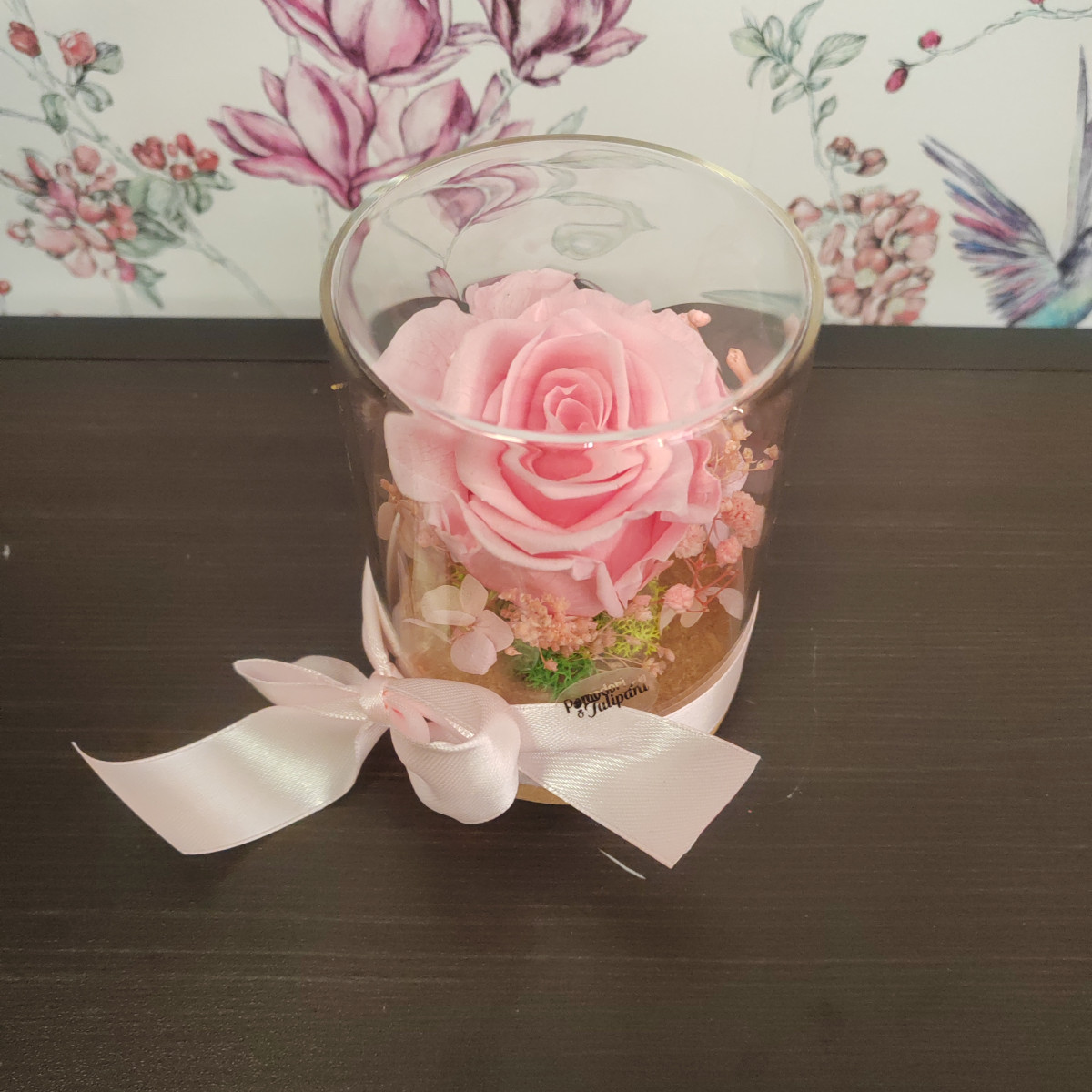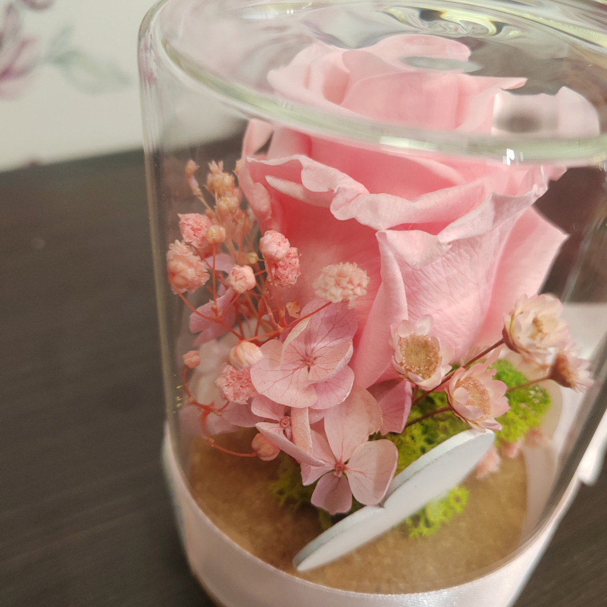 Composizione di fiori stabilizzati come rosa, glixia, ortensia, muschio nordico sotto vetro, in barattolo con tappo di sughero.