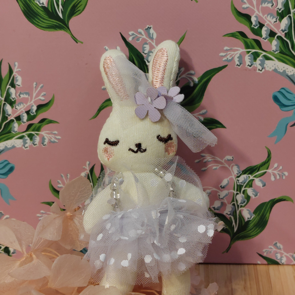 Coniglietta in stoffa molto morbida, con fiorellini e tulle in testa, perline come bretelle e gonnellina in tulle a pois.