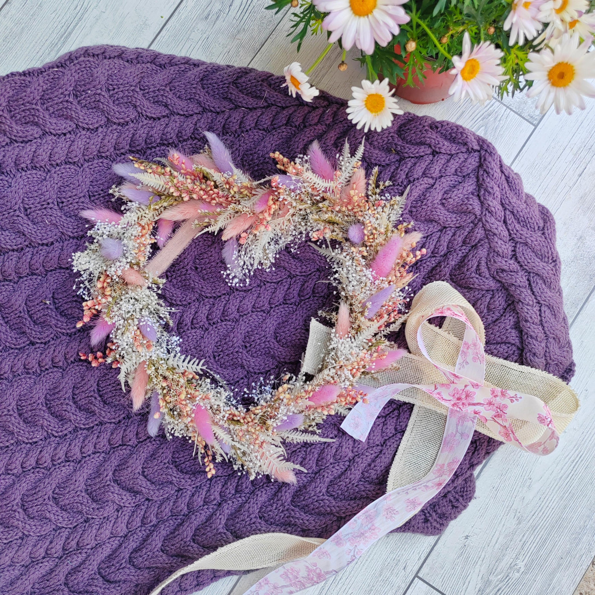 Ghirlanda a forma di cuore realizzata a mano con fiori secchi e stabilizzati, di lunga durata nel tempo.