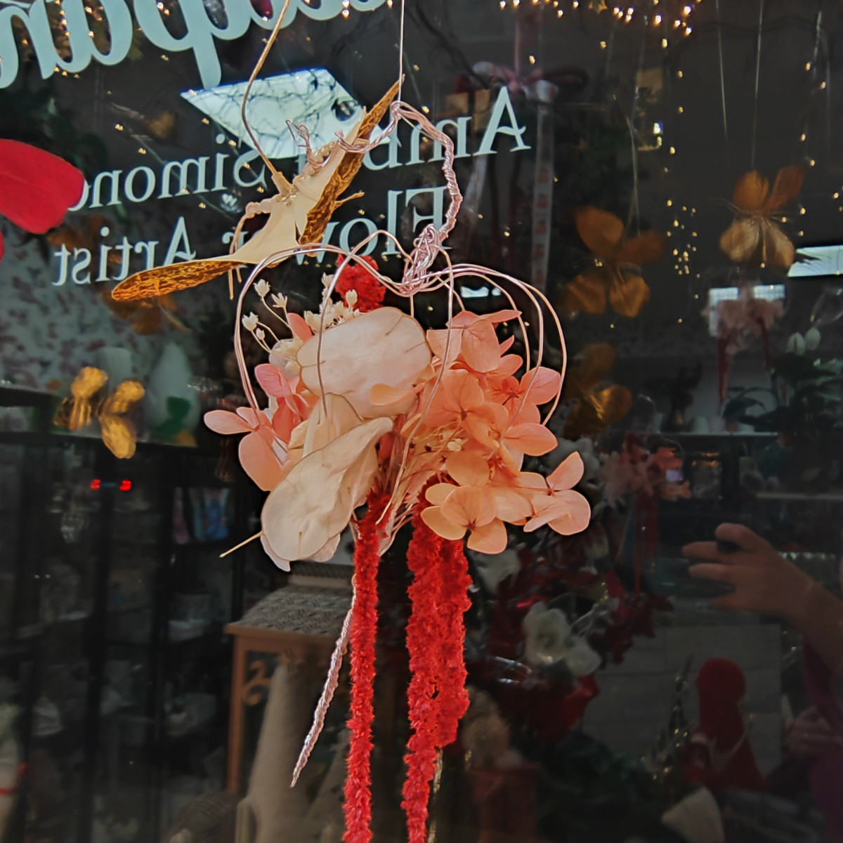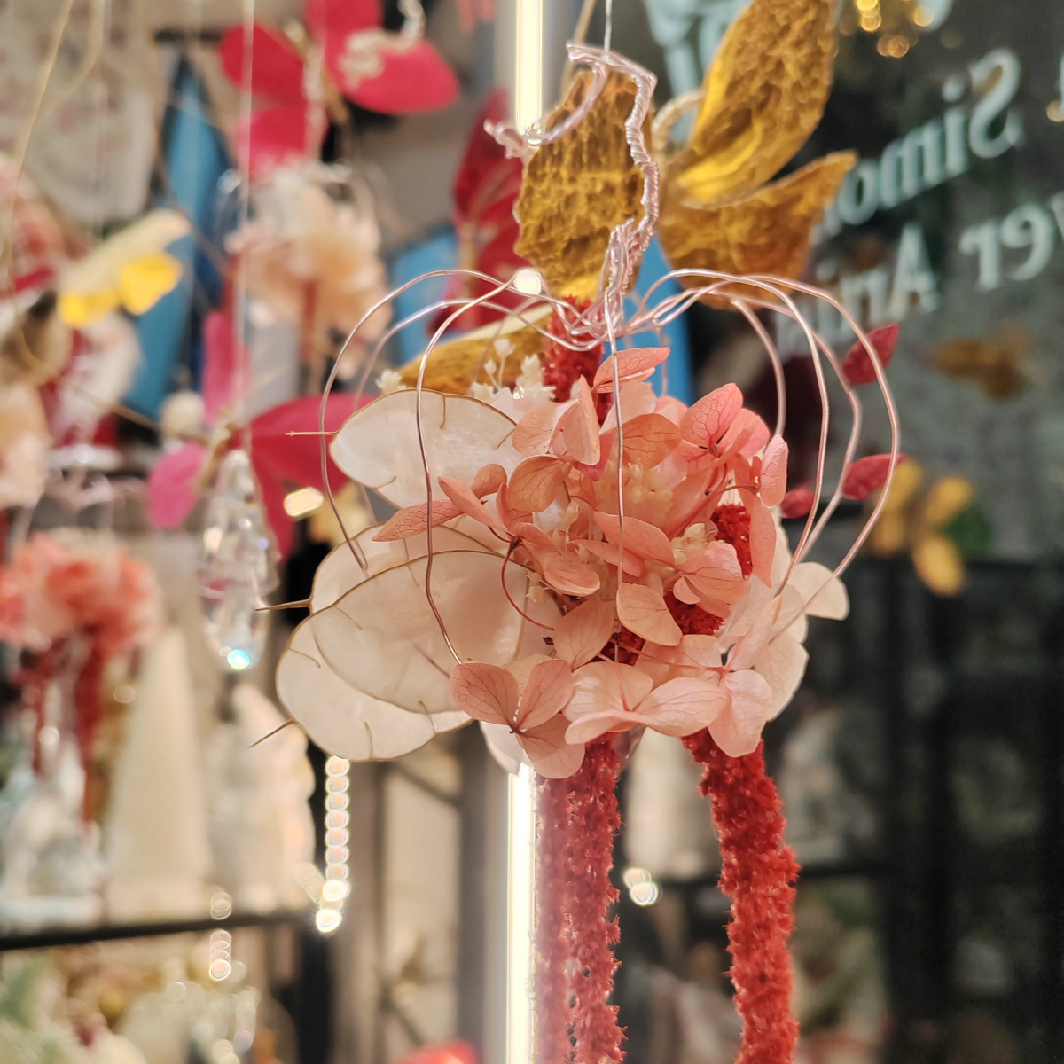 Decorazione realizzata interamente a mano con fil di ferro argentato o rosa e riempita con ortensie e fiori stabilizzati tra cui l’amaranto, che crea un affascinante effetto pendulo.