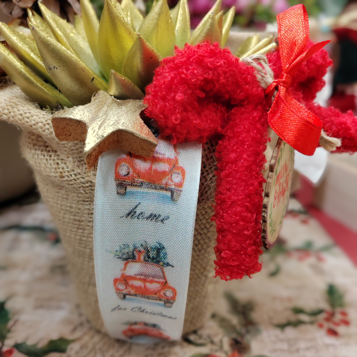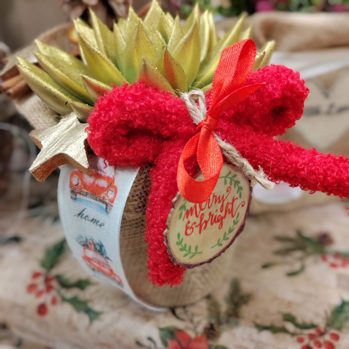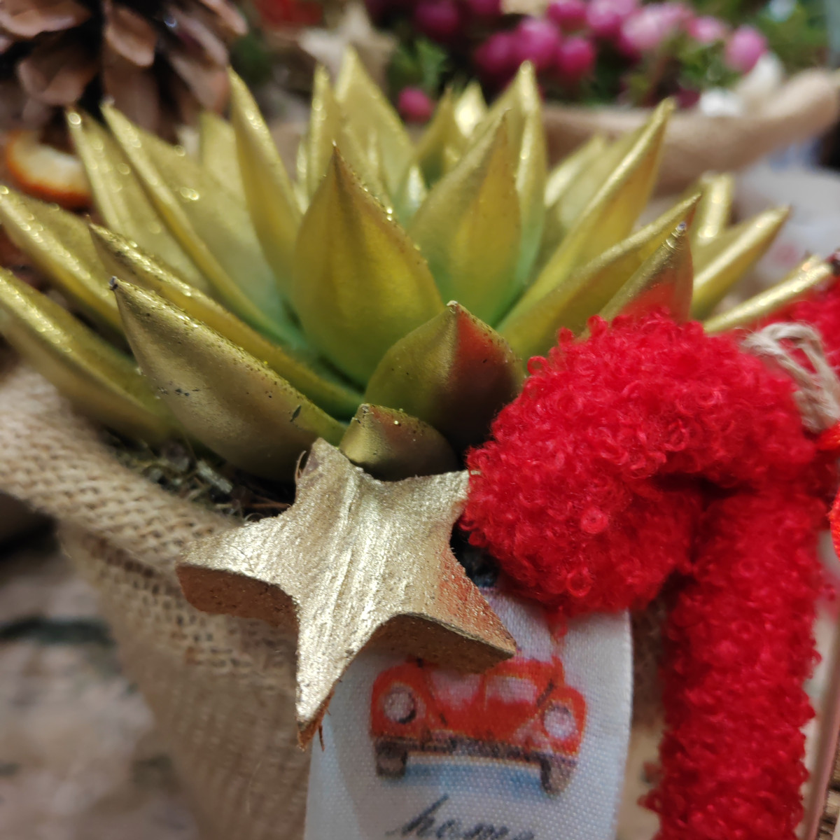 Echeveria oro in confezione di juta e decorazioni natalizie con scritta in lamella di legno “Merry & bright”