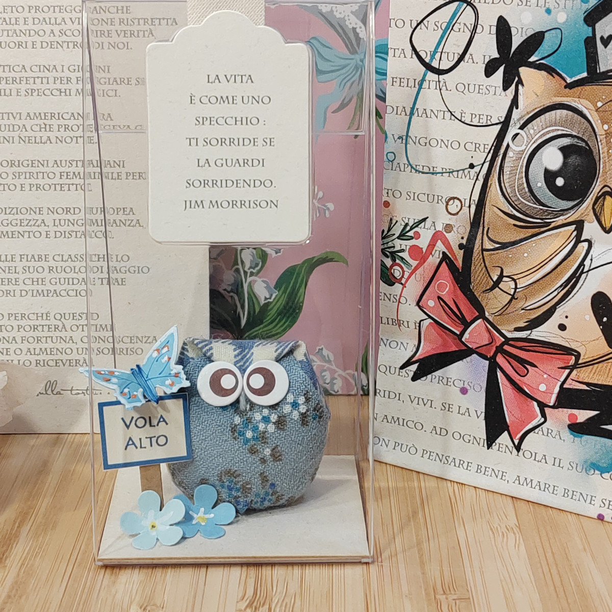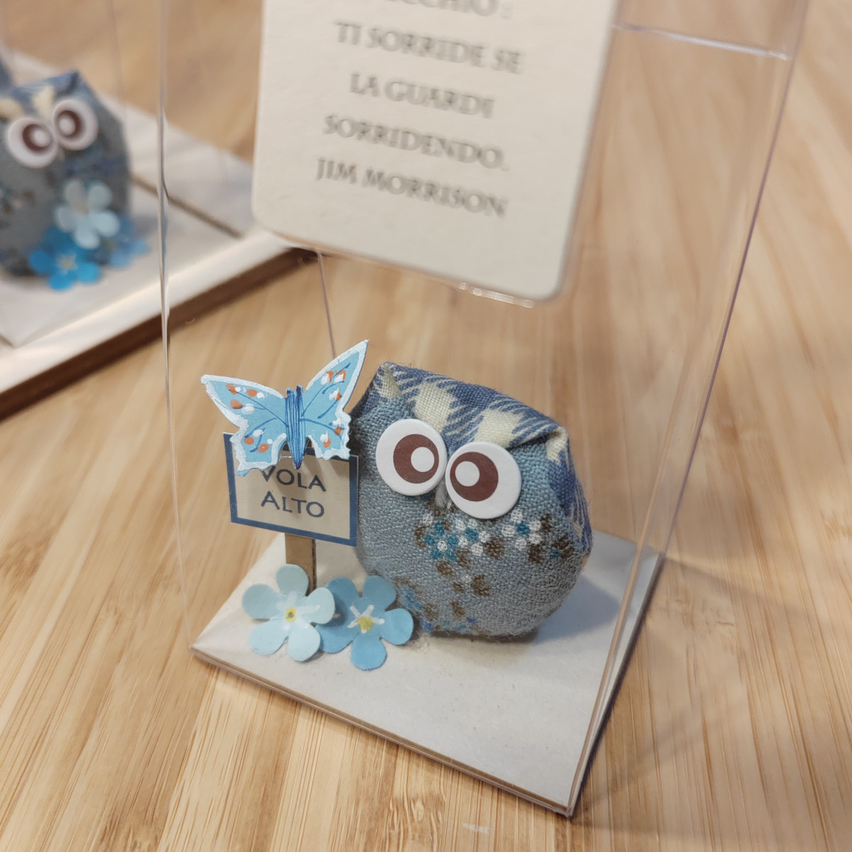 Gufetto in tessuto ed elementi decorativi, arricchito con messaggio e blister regalo.