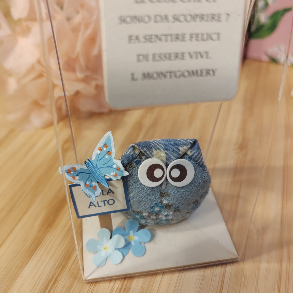 Gufetto in tessuto ed elementi decorativi, arricchito con messaggio e blister regalo.