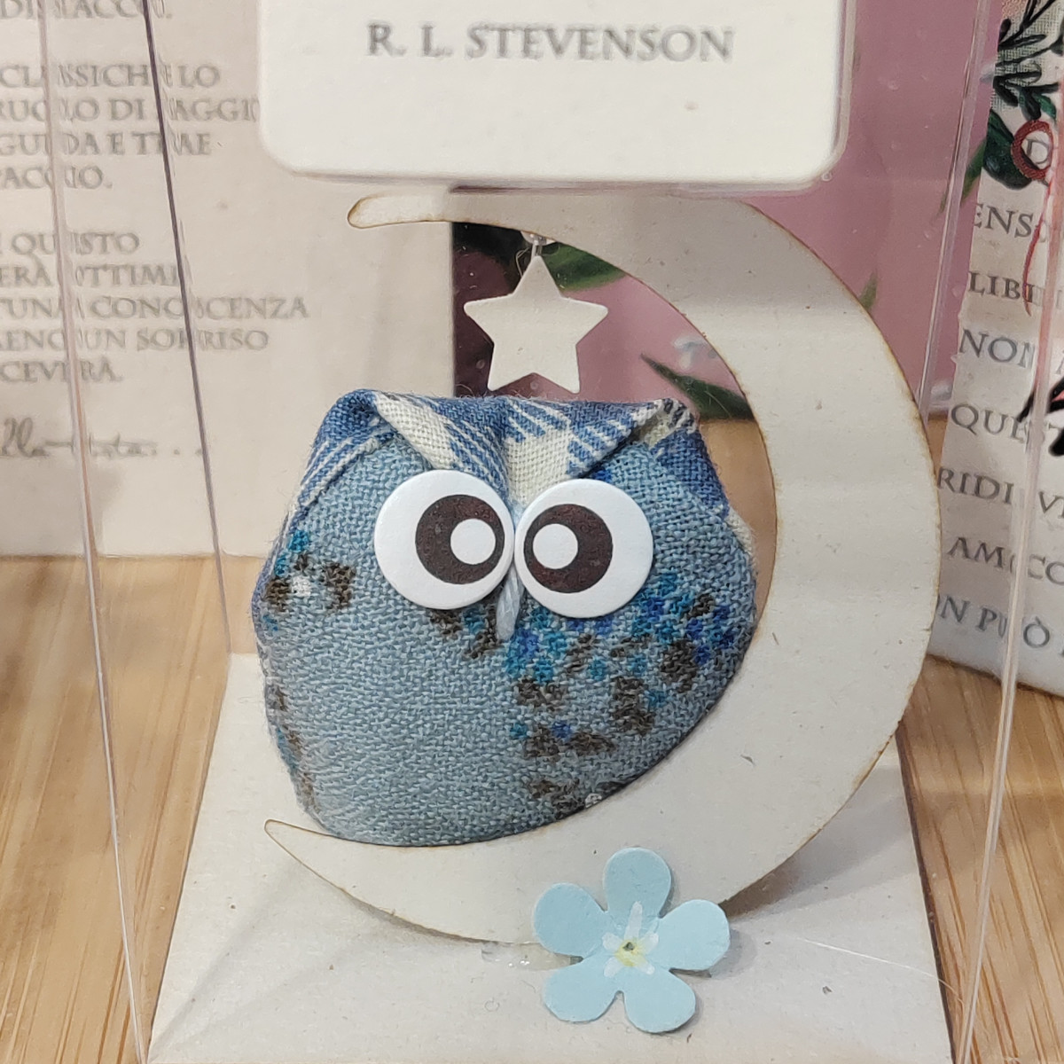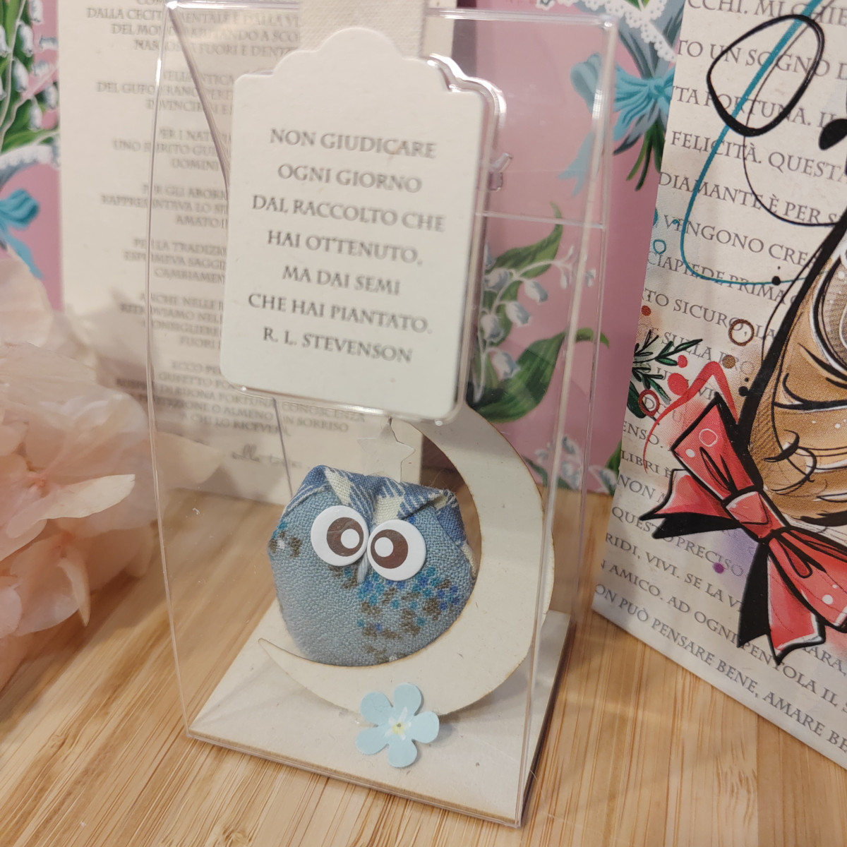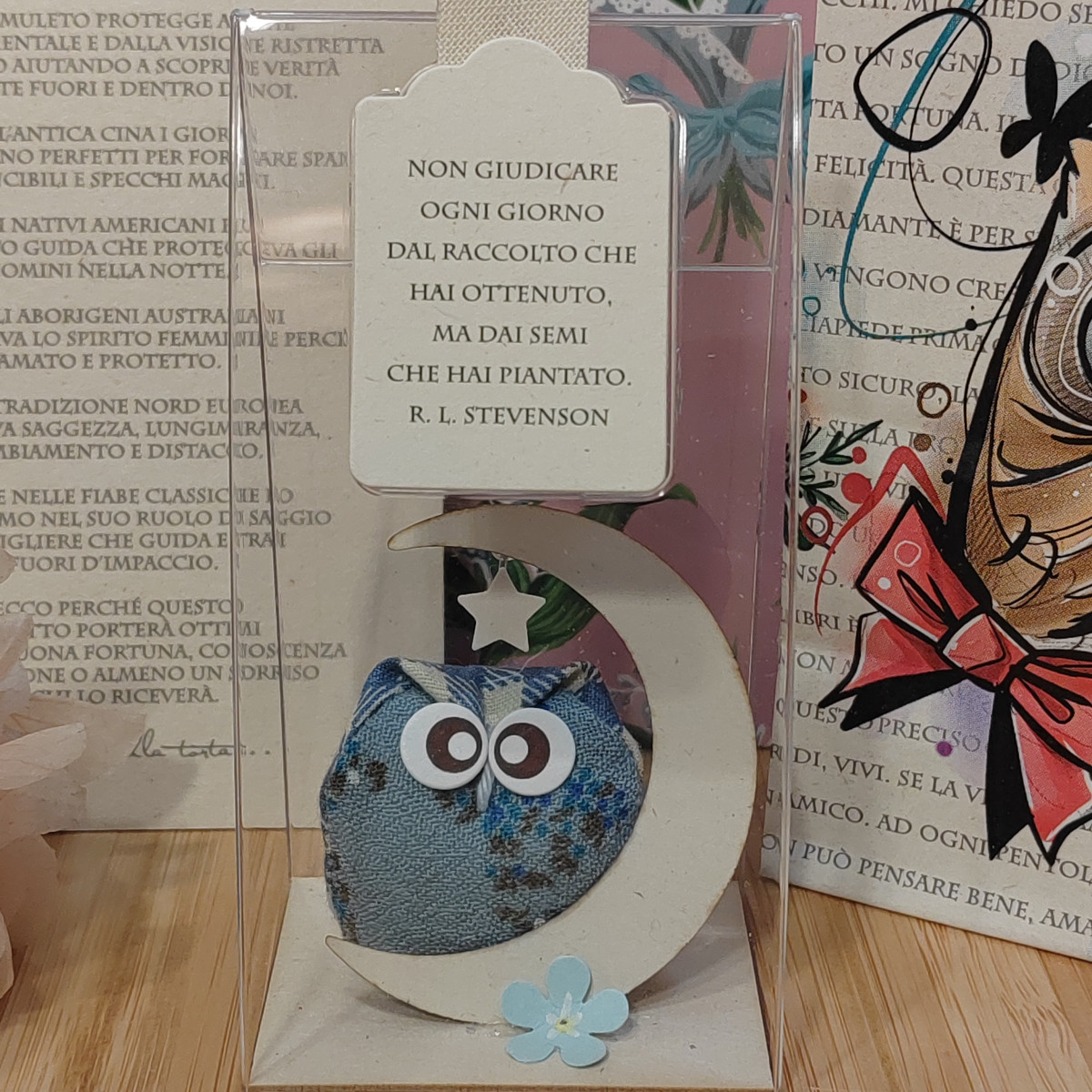 Gufetto in tessuto ed elementi decorativi, arricchito con messaggio e blister regalo.