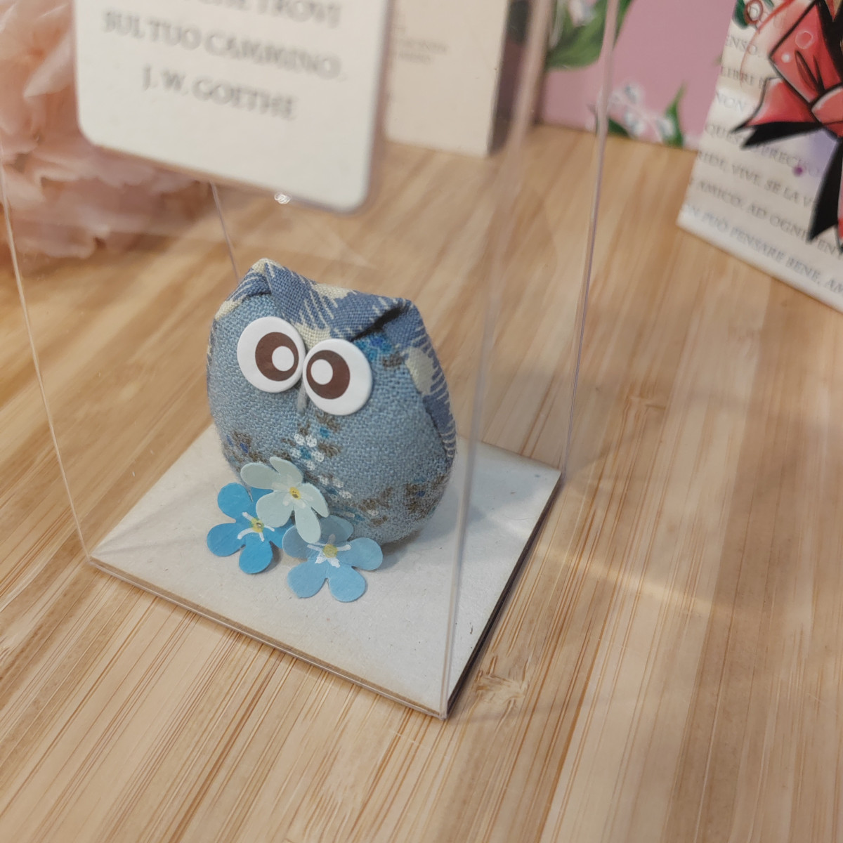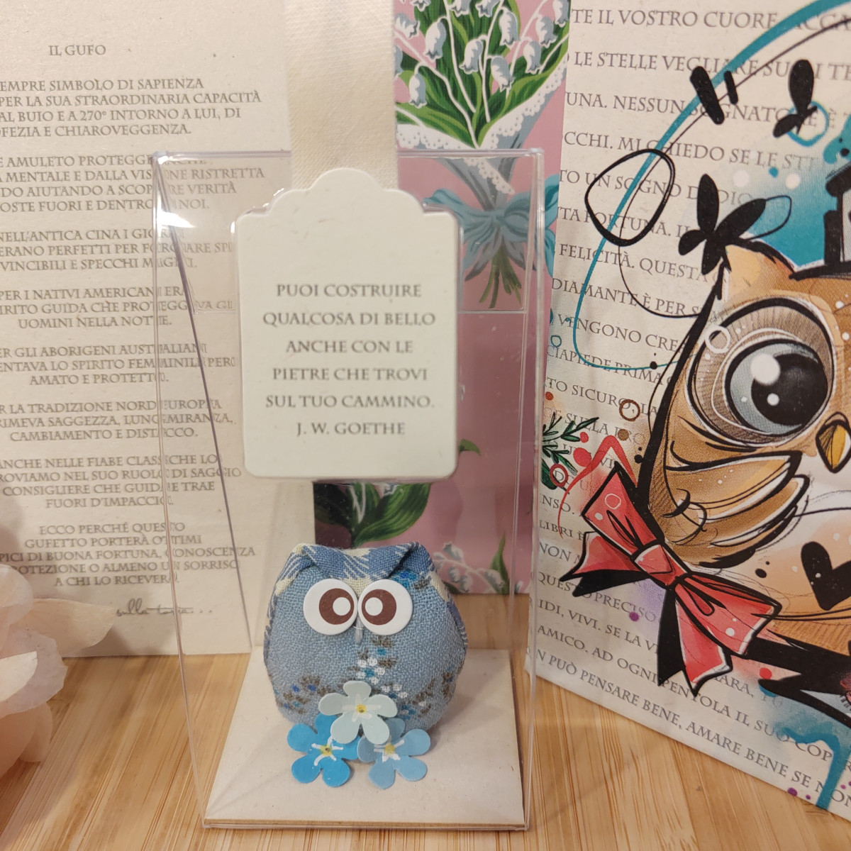 Gufetto in tessuto ed elementi decorativi, arricchito con messaggio e blister regalo.