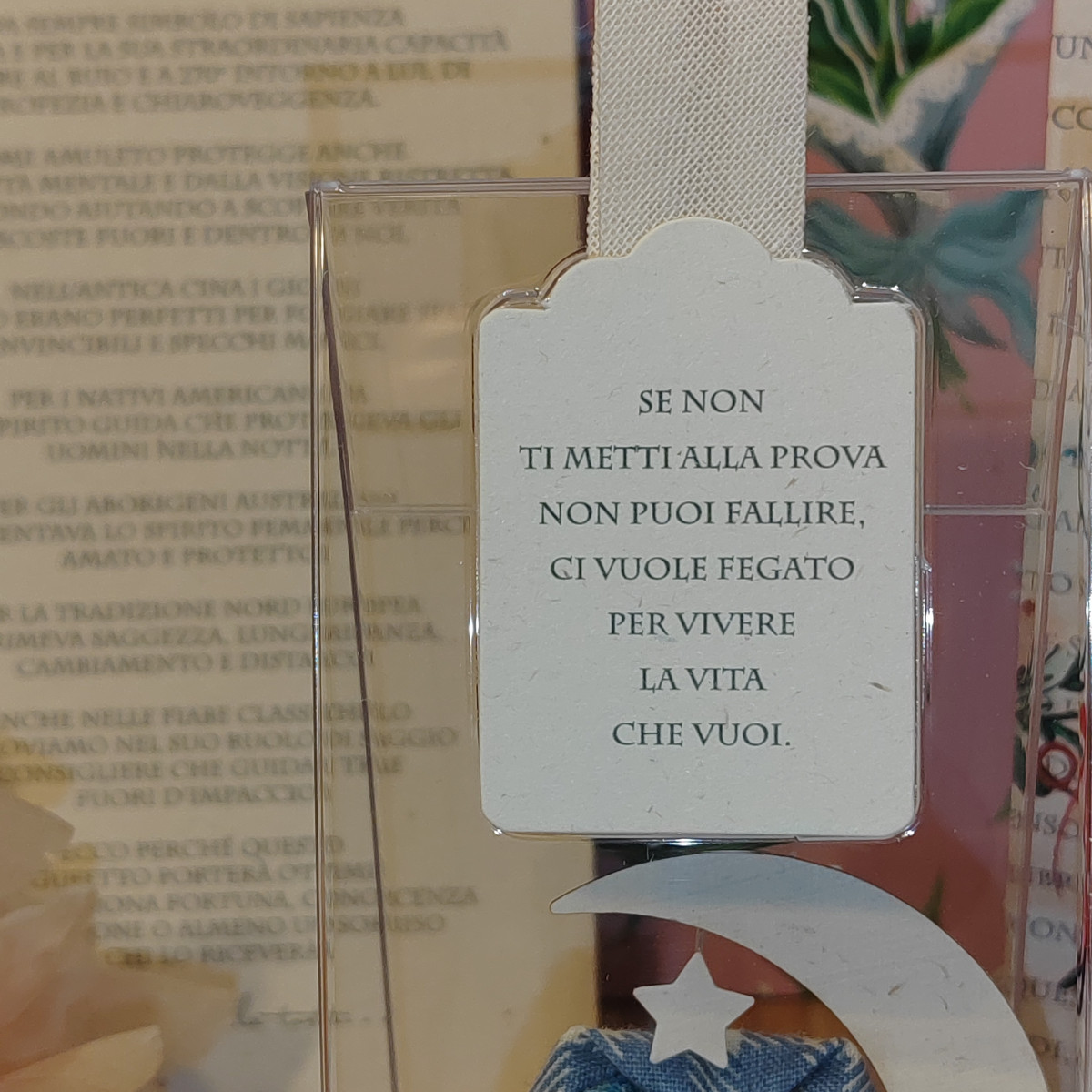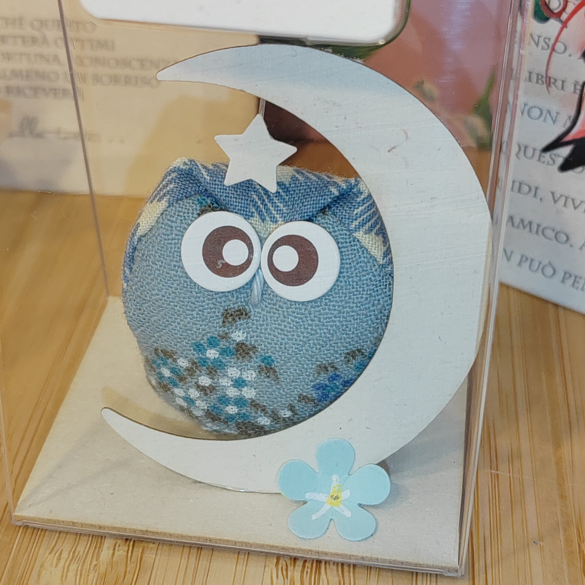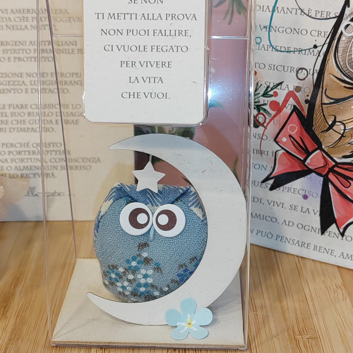 Gufetto in tessuto ed elementi decorativi, arricchito con messaggio e blister regalo.