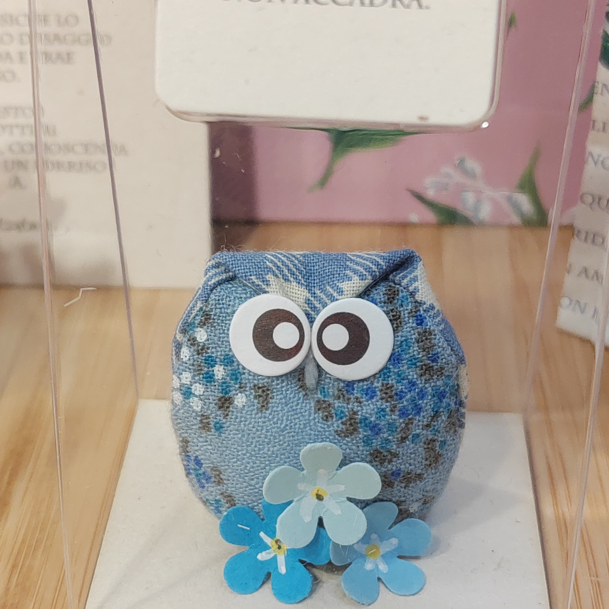 Gufetto in tessuto ed elementi decorativi, arricchito con messaggio e blister regalo.