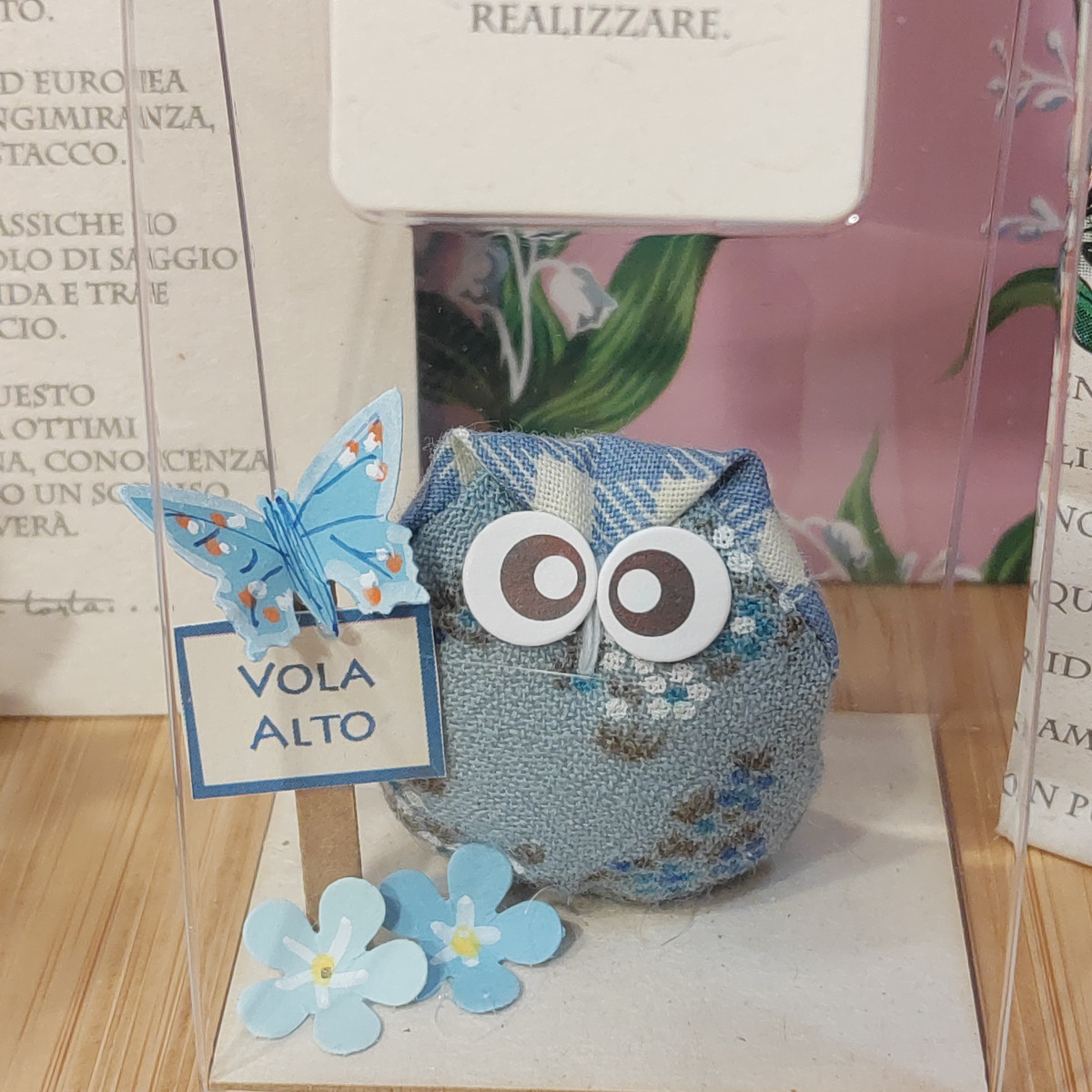 Gufetto in tessuto ed elementi decorativi, arricchito con messaggio e blister regalo.