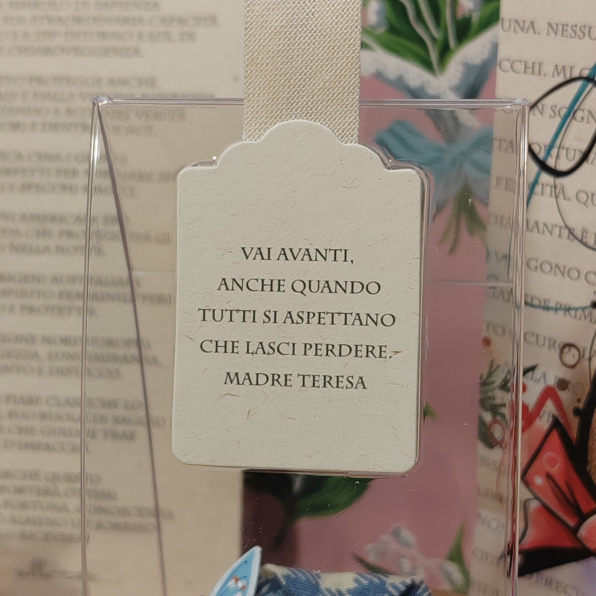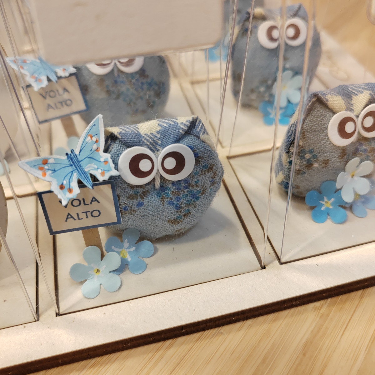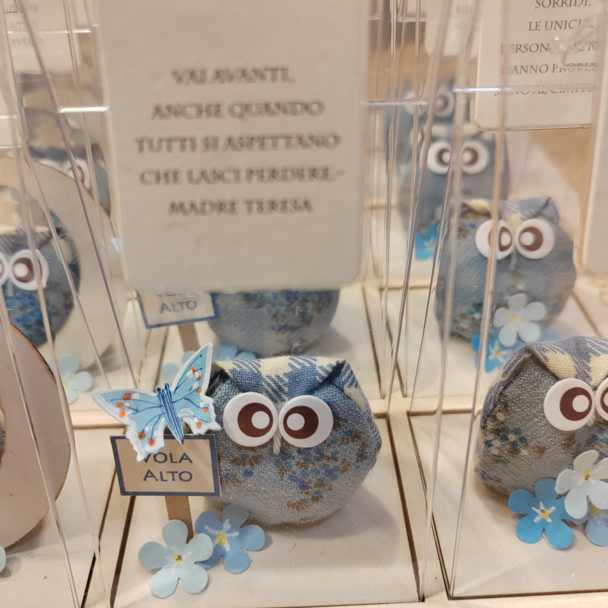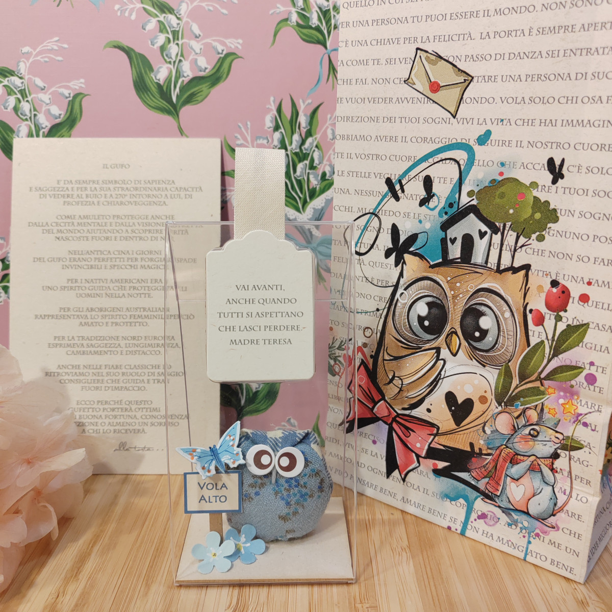 Gufetto in tessuto ed elementi decorativi, arricchito con messaggio e blister regalo.