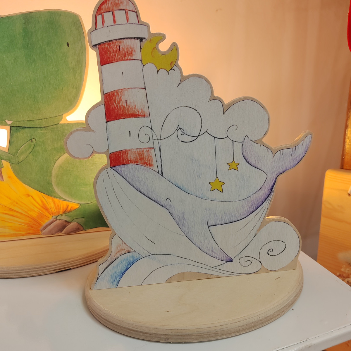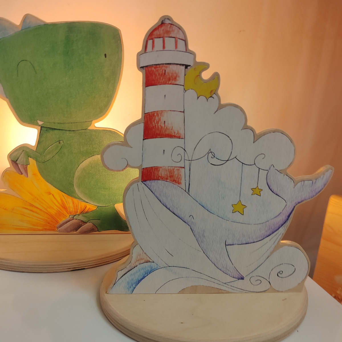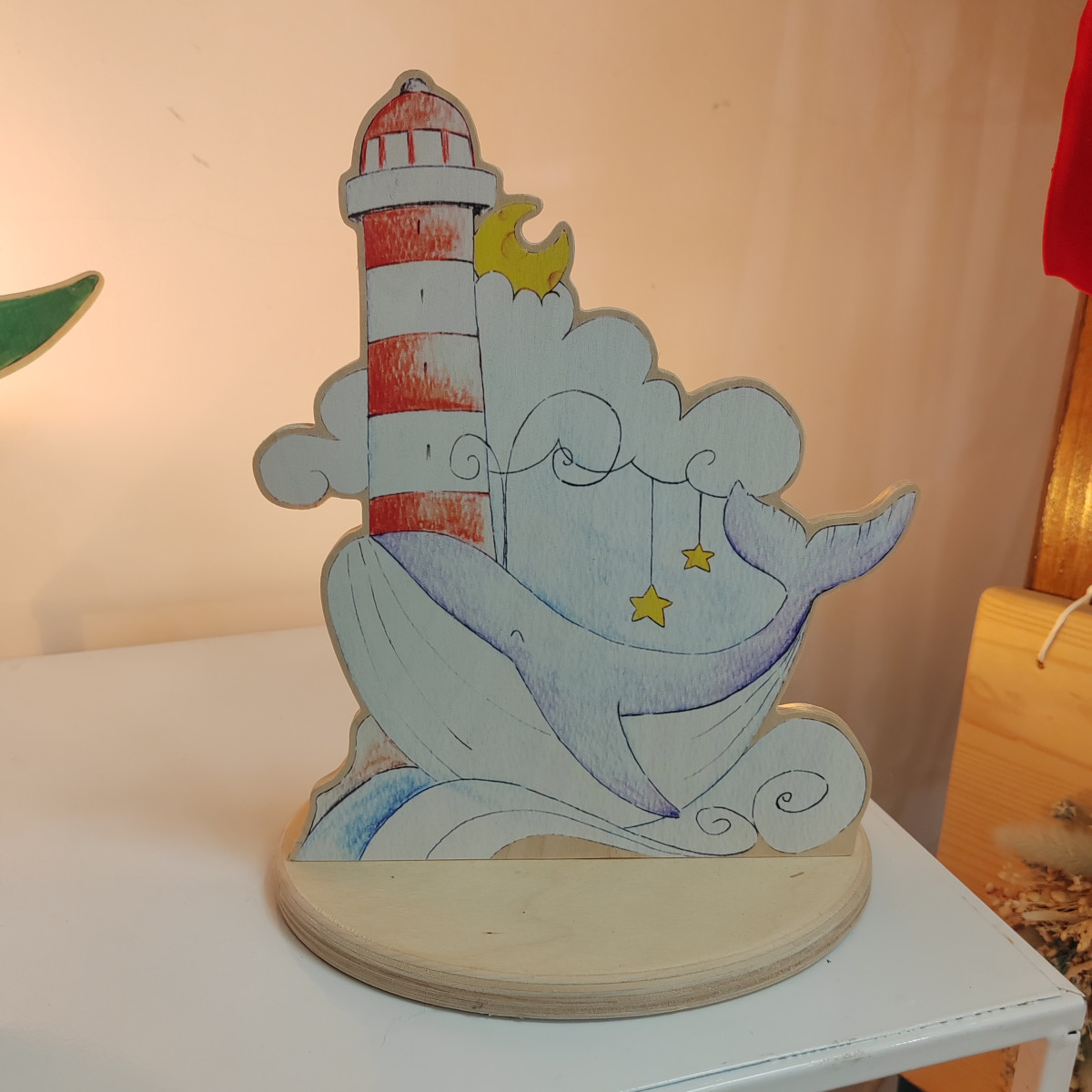 Lampada artigianale in legno, realizzata e dipinta a mano.
