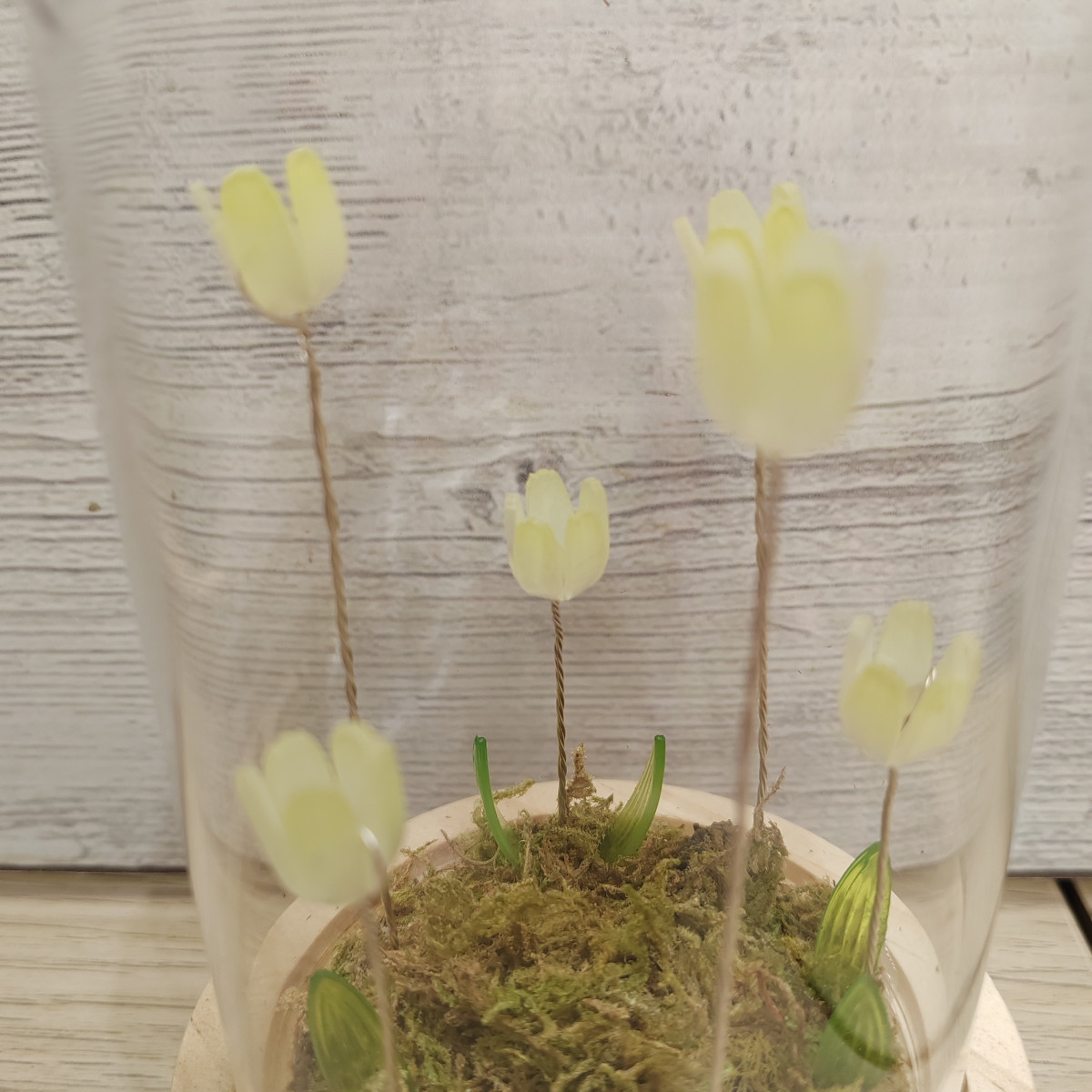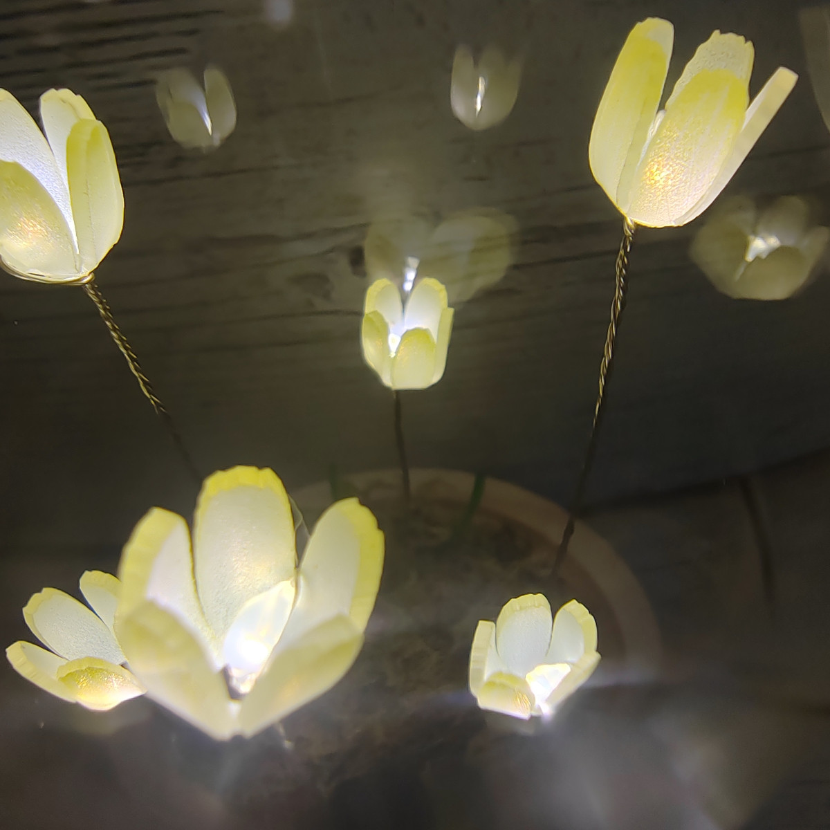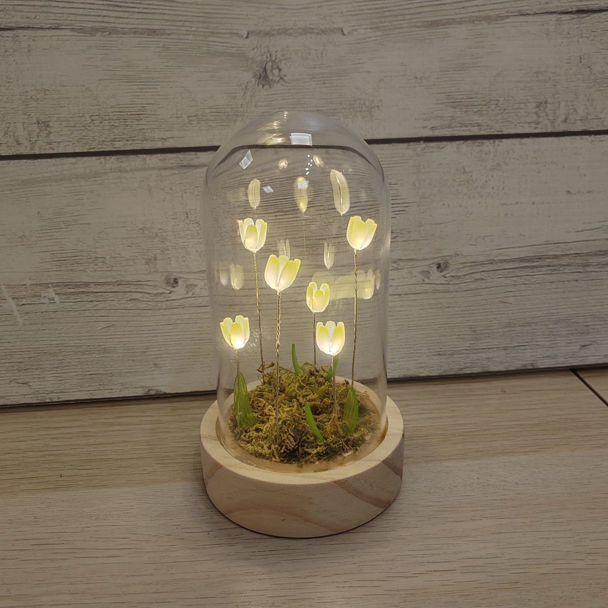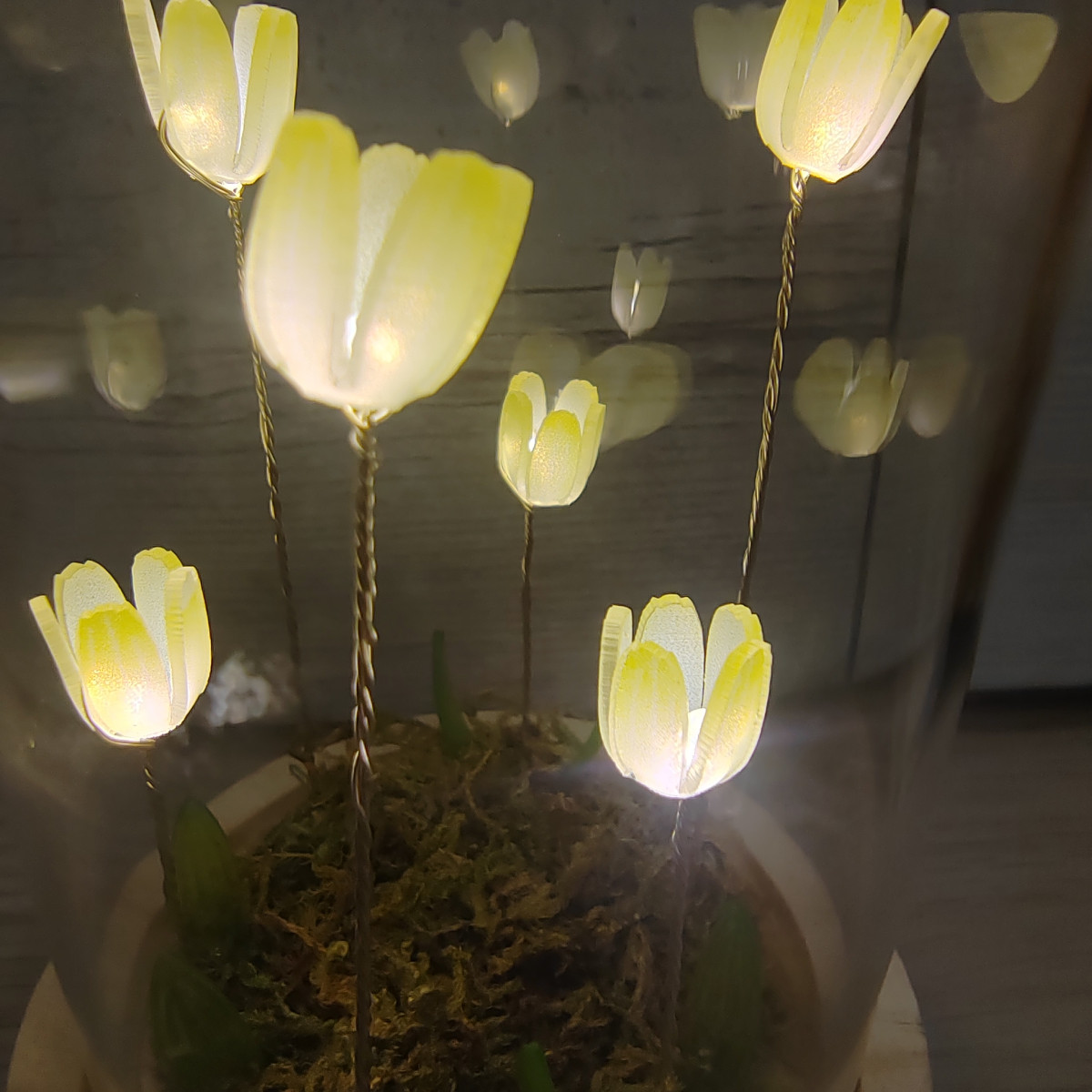 Lampada a forma di campana di vetro con fiori di tulipano che si accendono.