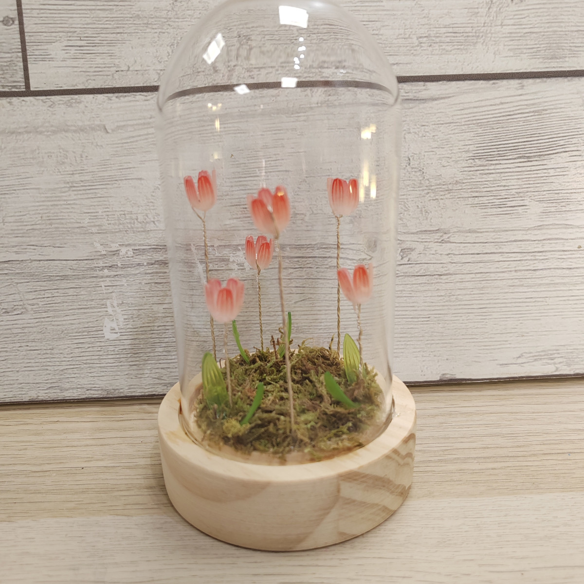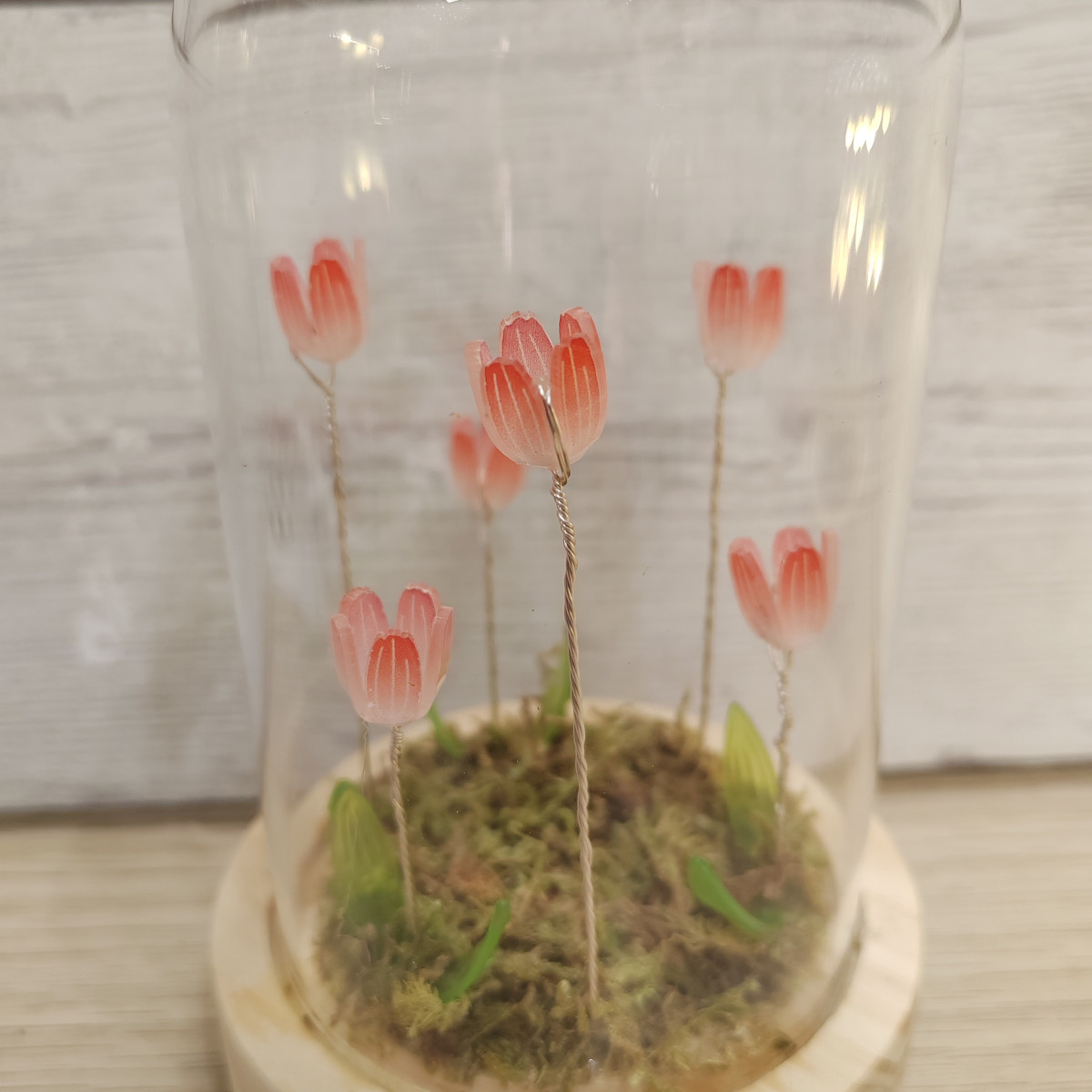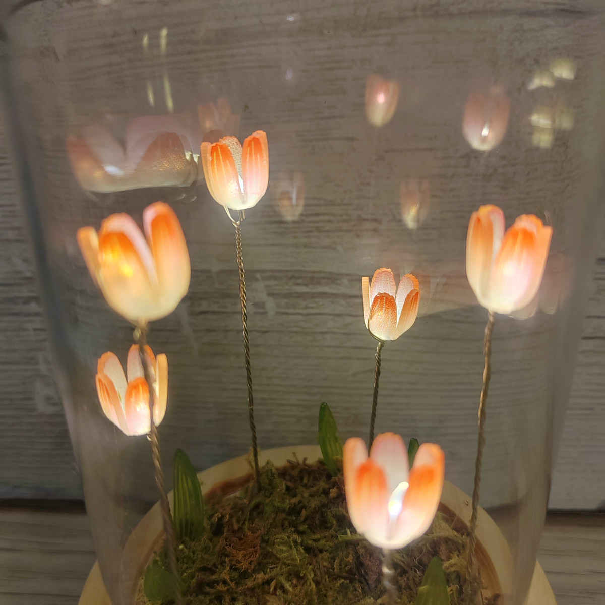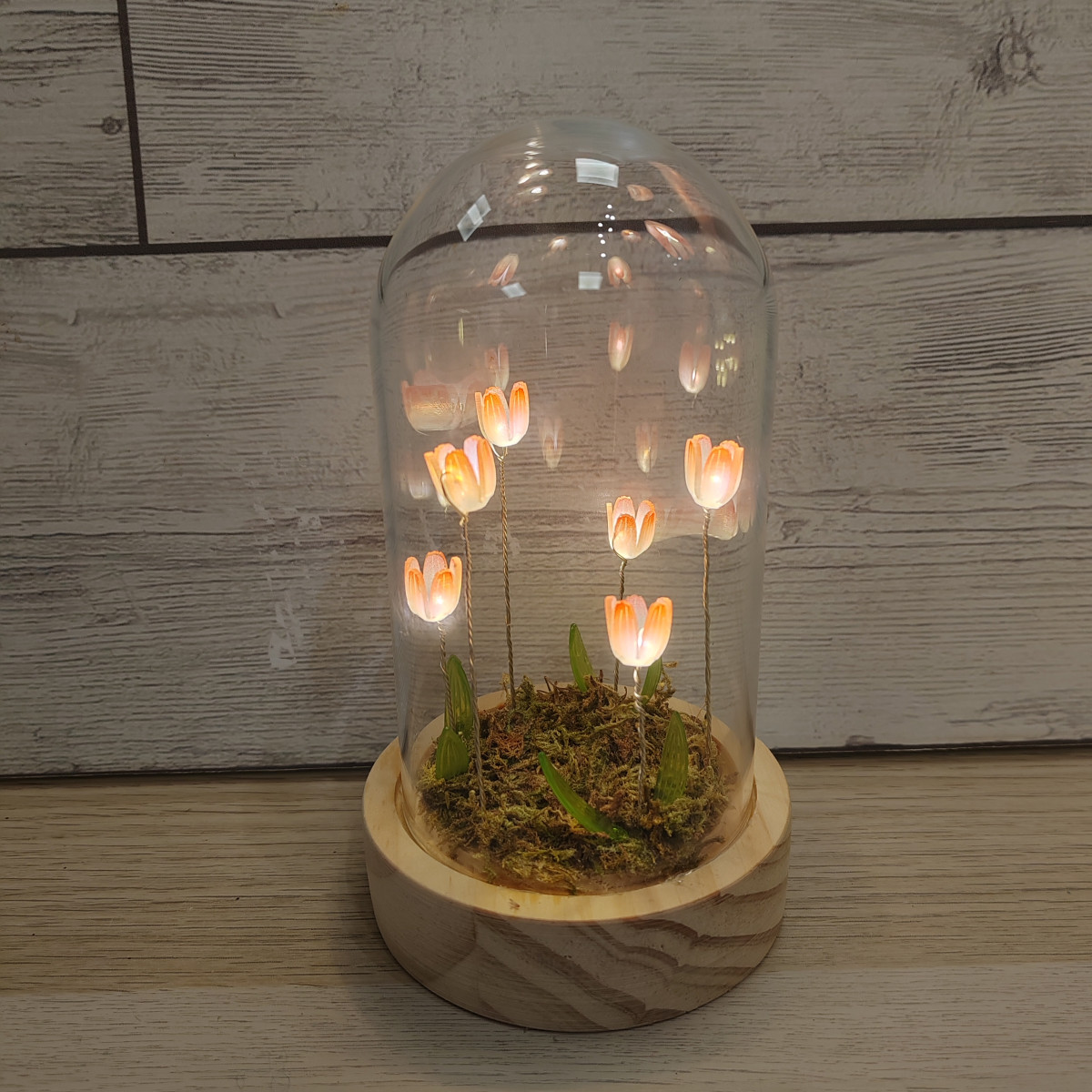 Lampada a forma di campana di vetro con fiori di tulipano che si accendono.