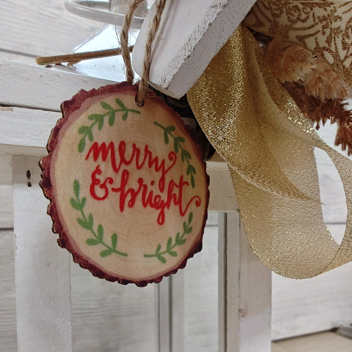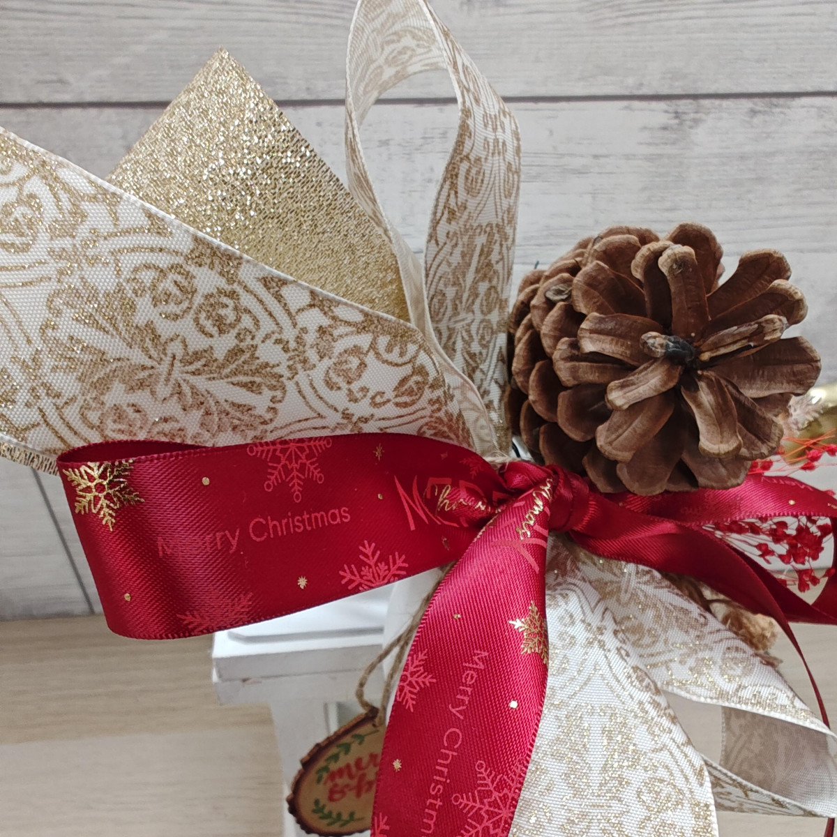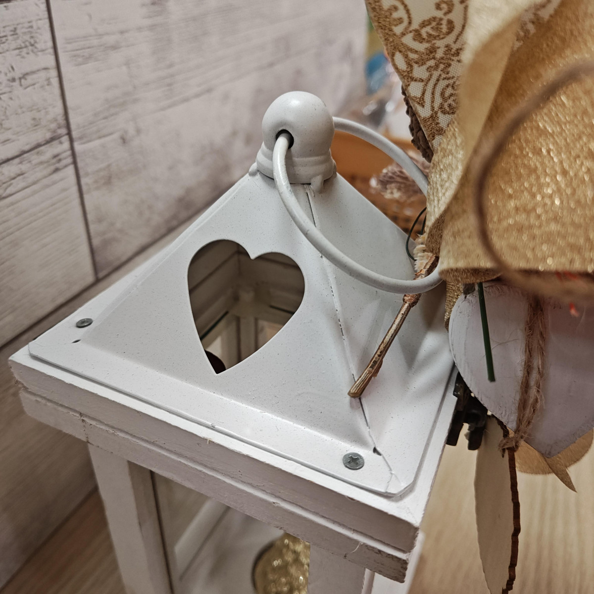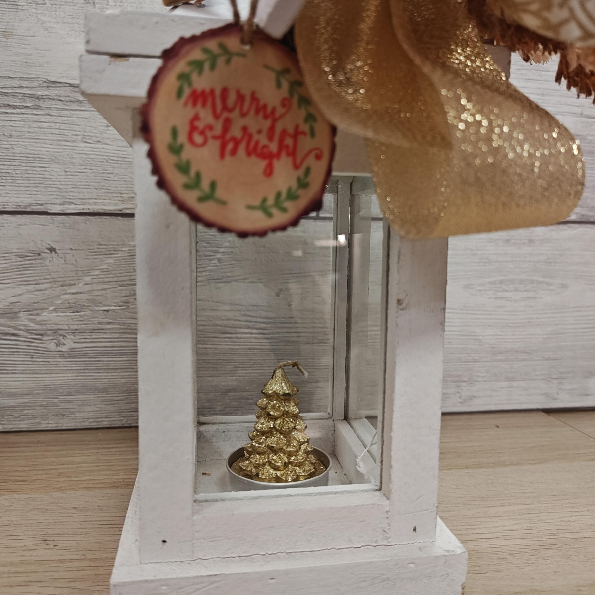 Lanterna di legno e metallo con, all’interno, candela a forma di albero di Natale; decorata con fiocco pregiato e altri elementi decorativi e dotata di gancio per appendere