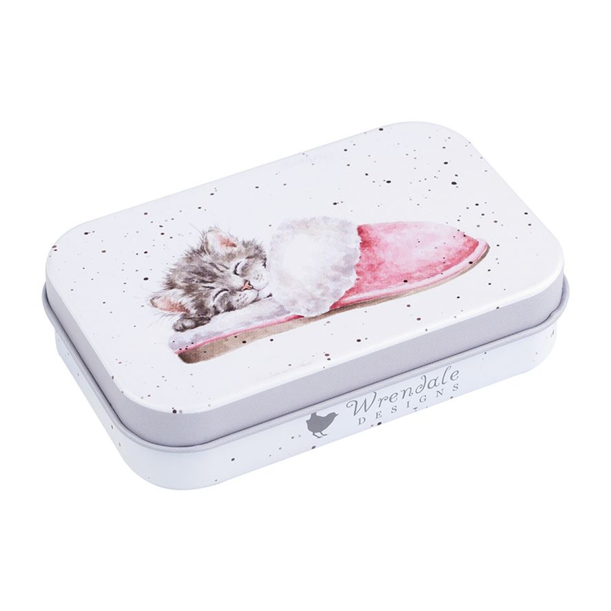 Scatolina firmata Wrendale Designs, in latta e dalle dimensioni 9,5 x 6 cm, caratteristica per avere illustrazioni su tutte le facciate della scatolina, compreso l’interno.
