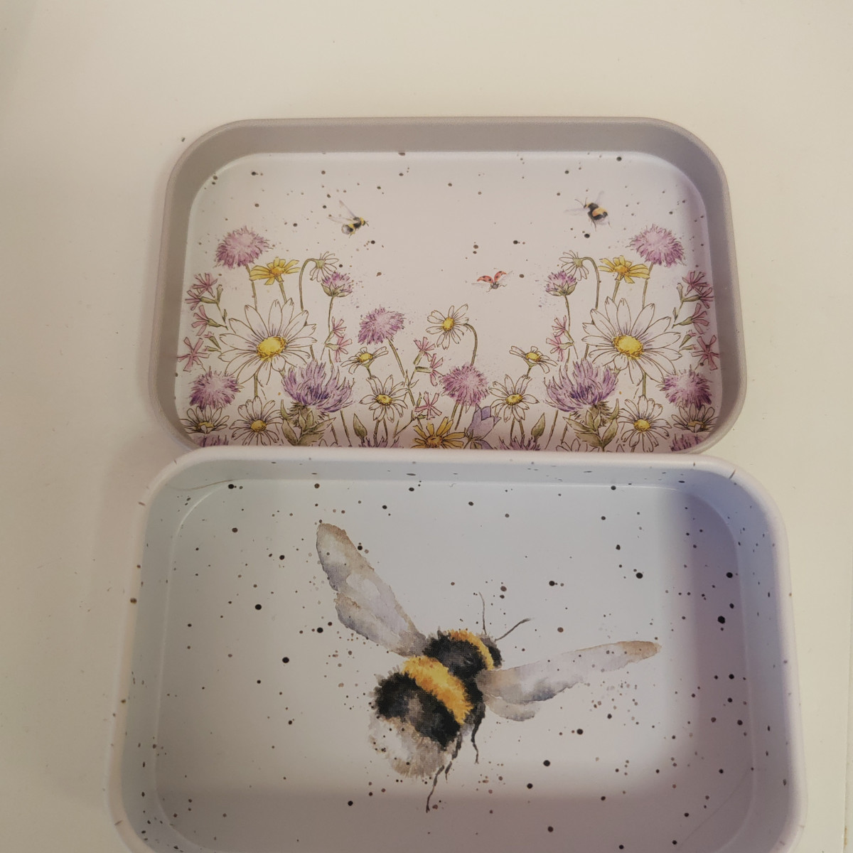 Scatolina firmata Wrendale Designs, in latta e dalle dimensioni 9,5 x 6 cm, caratteristica per avere illustrazioni su tutte le facciate della scatolina, compreso l’interno.