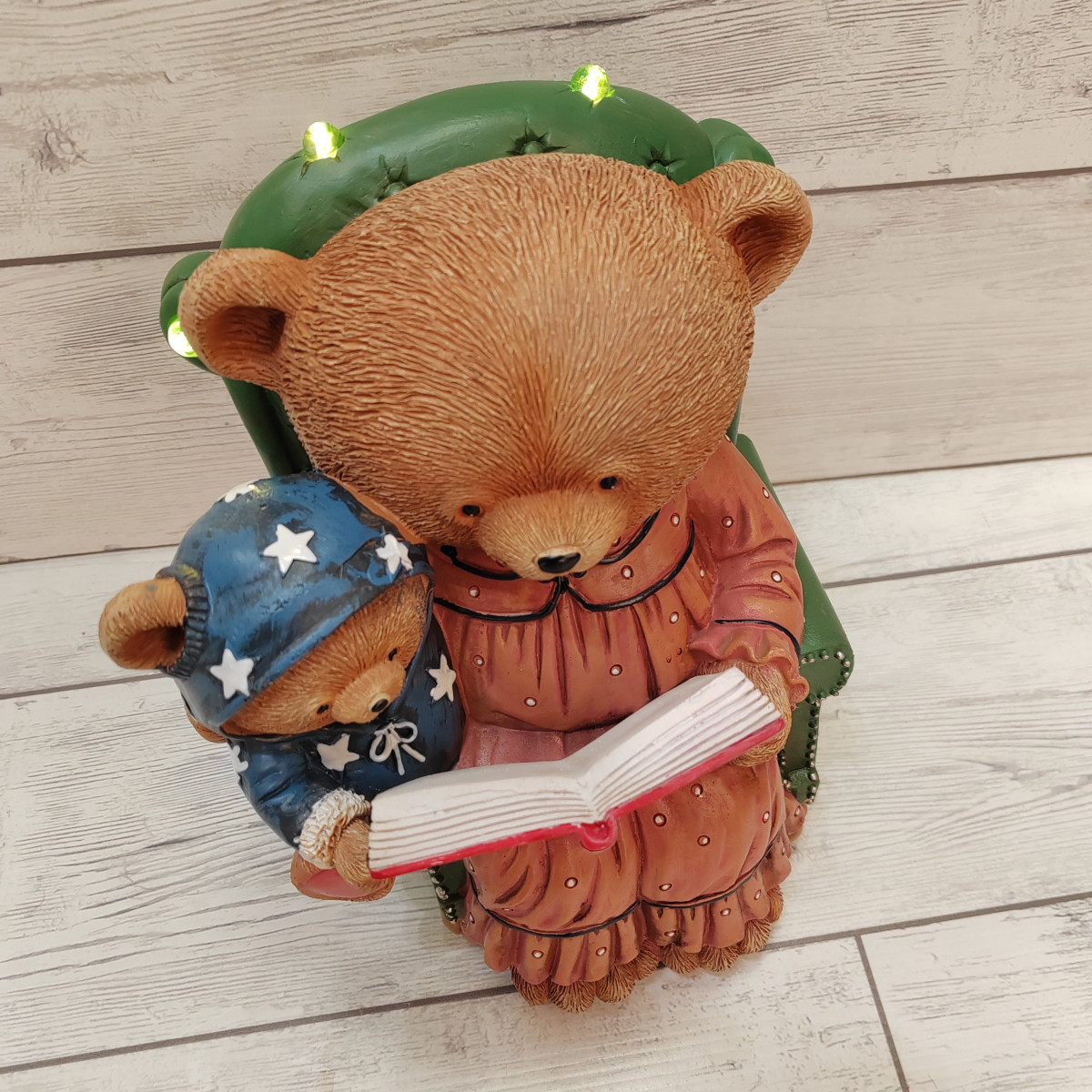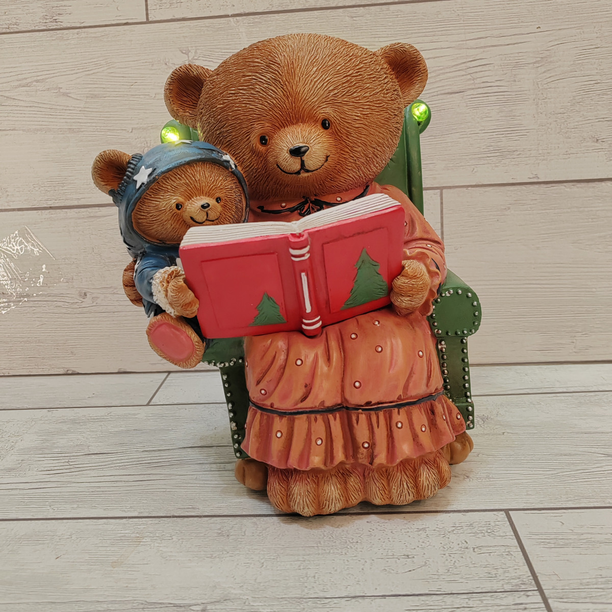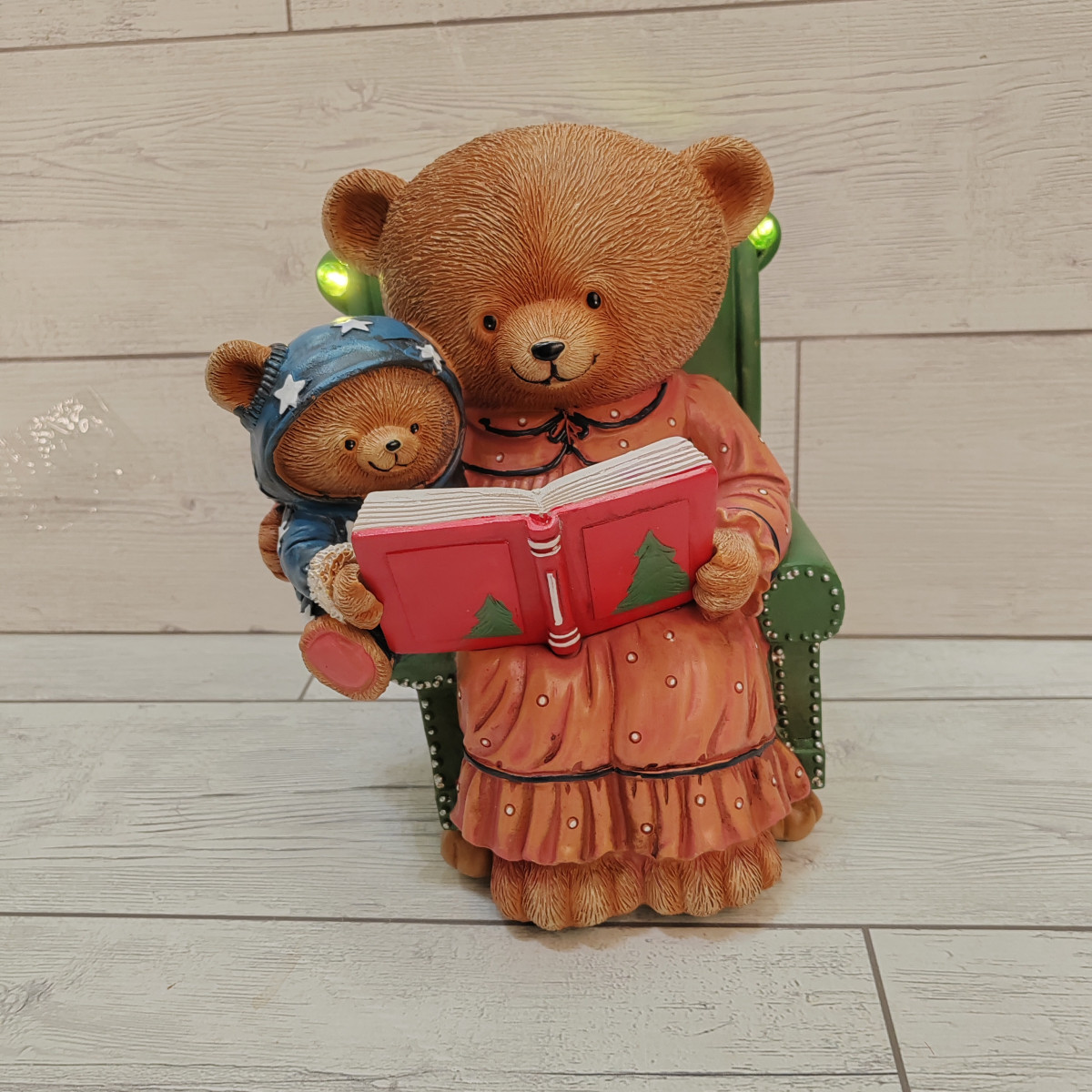 Statuina di mamma orsa che legge la favola di Natale al suo cucciolo. Dotata di illuminazione led dietro con luce verde.