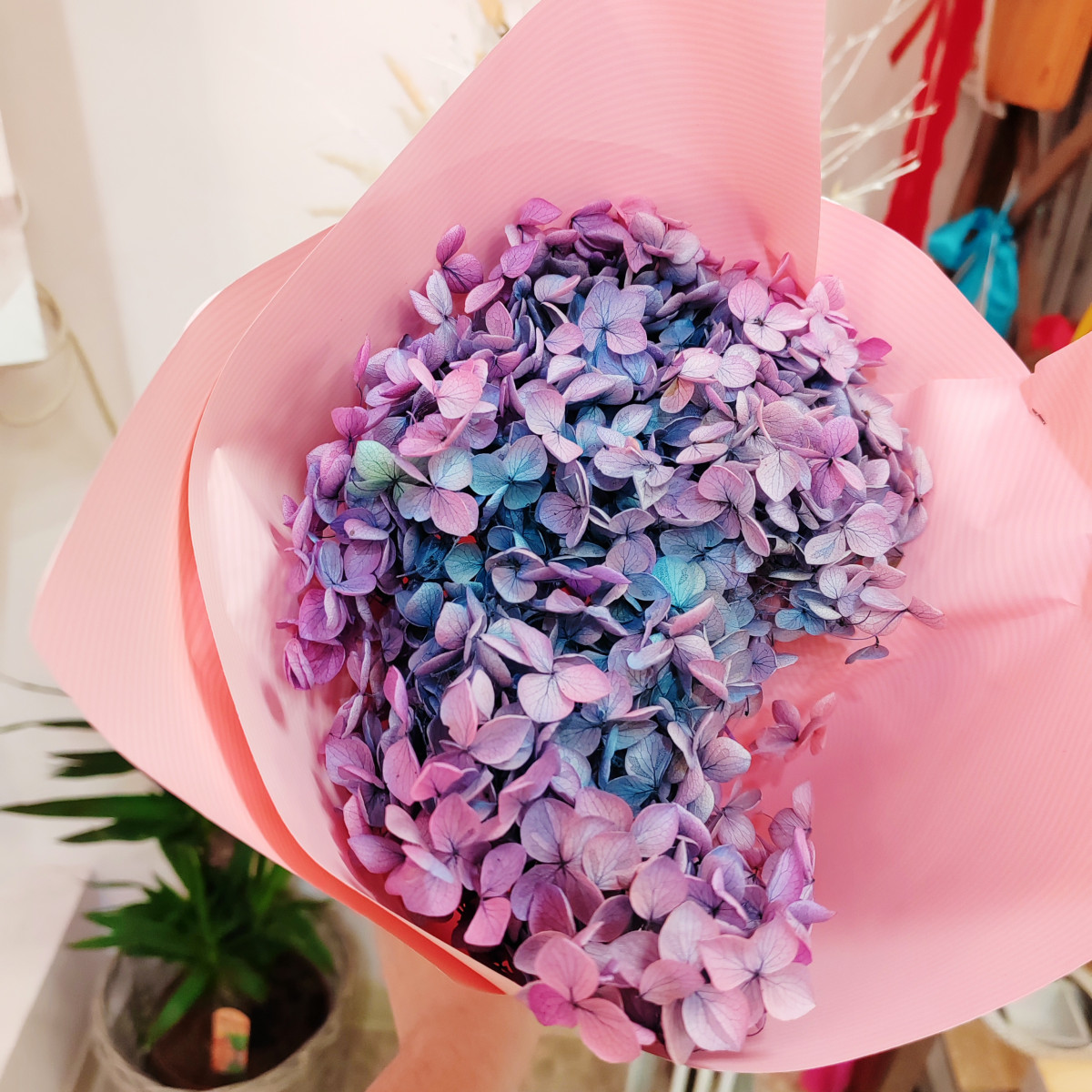 Ortensia stabilizzata in gradazione azzurro polvere, lilla, fuxia