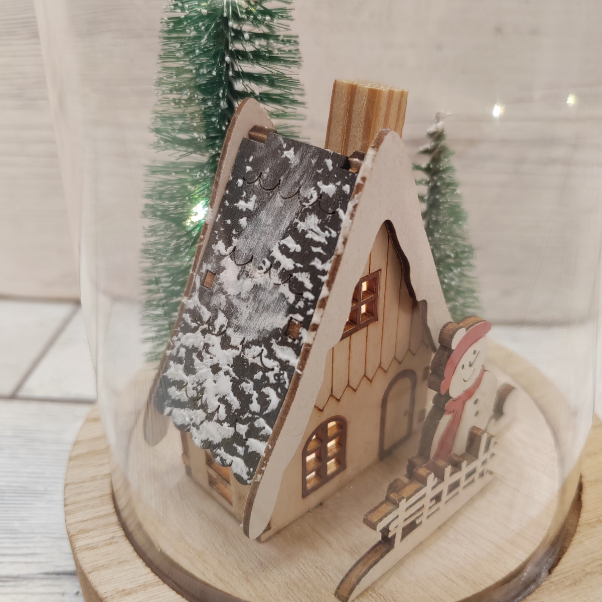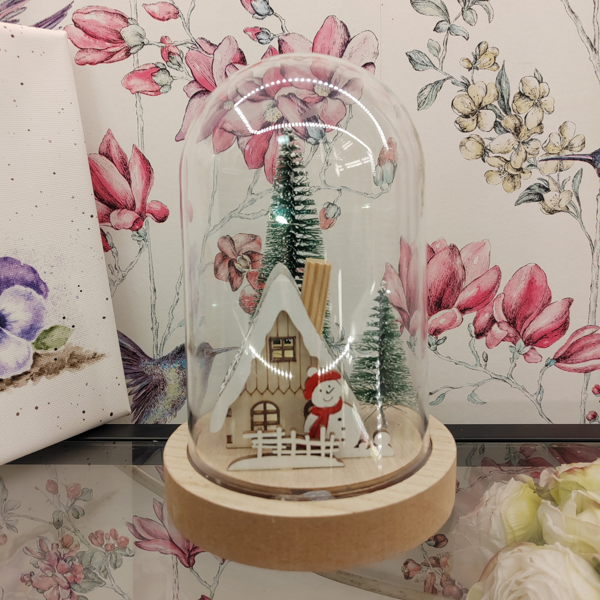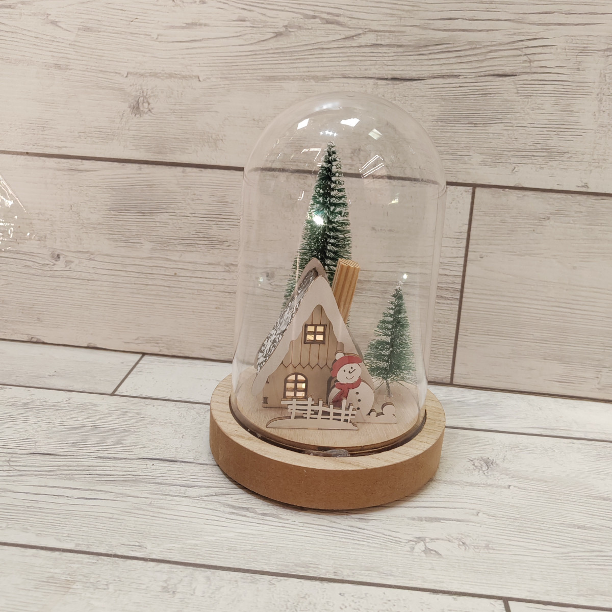 Paesaggio natalizio con pupazzo neve sotto campana vetro alta 17 cm.