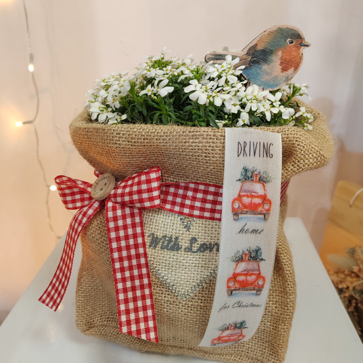 Confezionata in juta con scritta “with love” e un nastrino vintage sul rosso. Il pettirosso conferisce alla composizione un tocco di tenerezza e dolcezza.