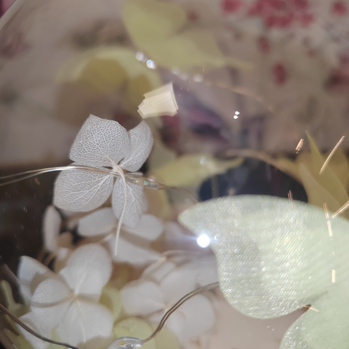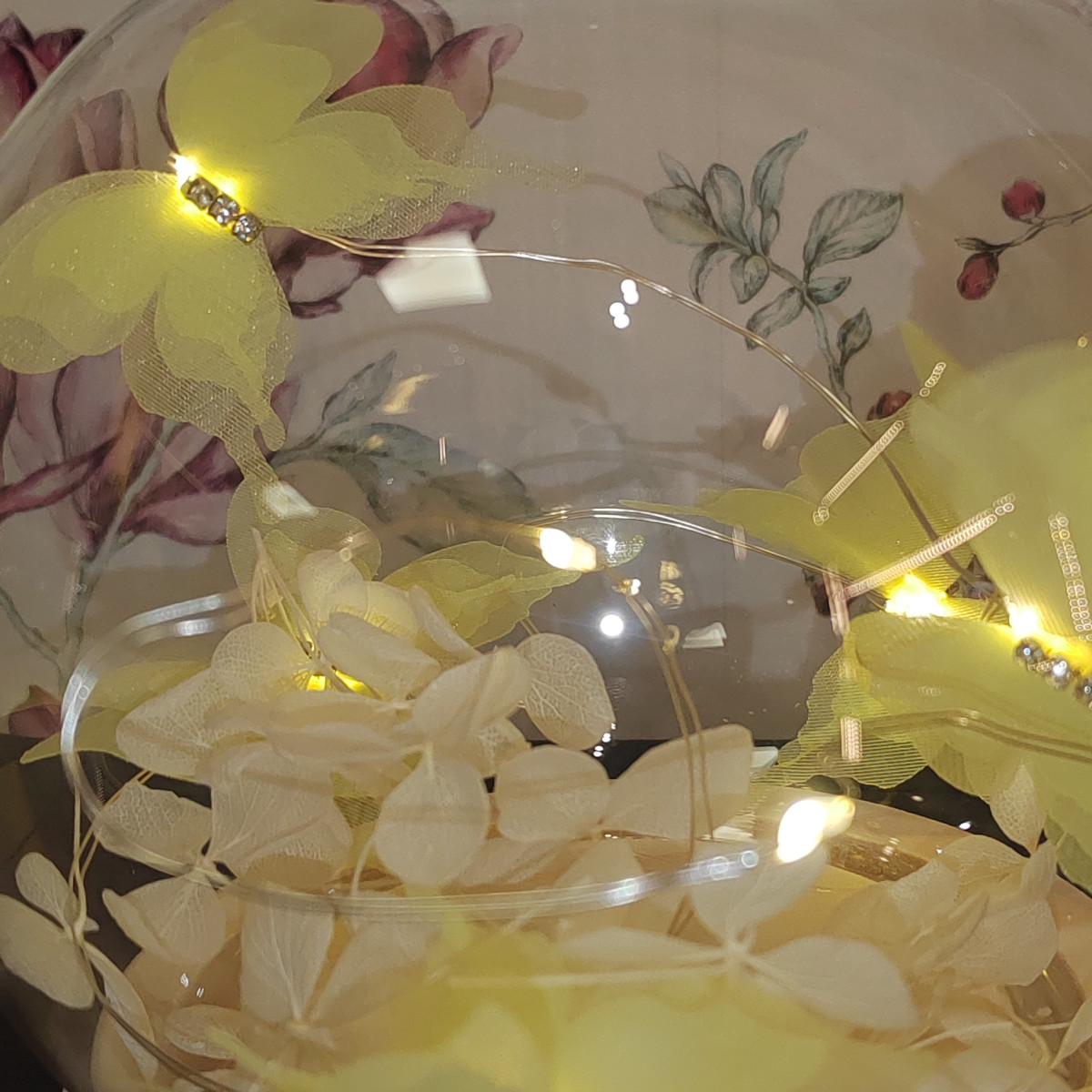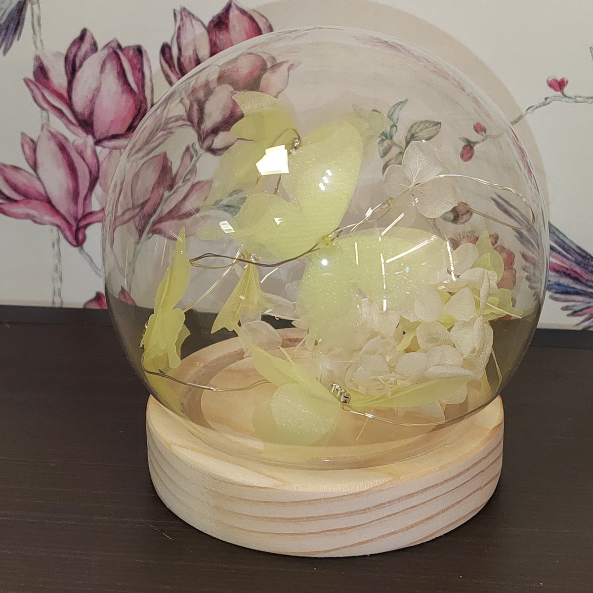 Sfera in vetro con led a batteria interni con all’interno farfalline in tessuto con brillantini e ortensie bianche.
