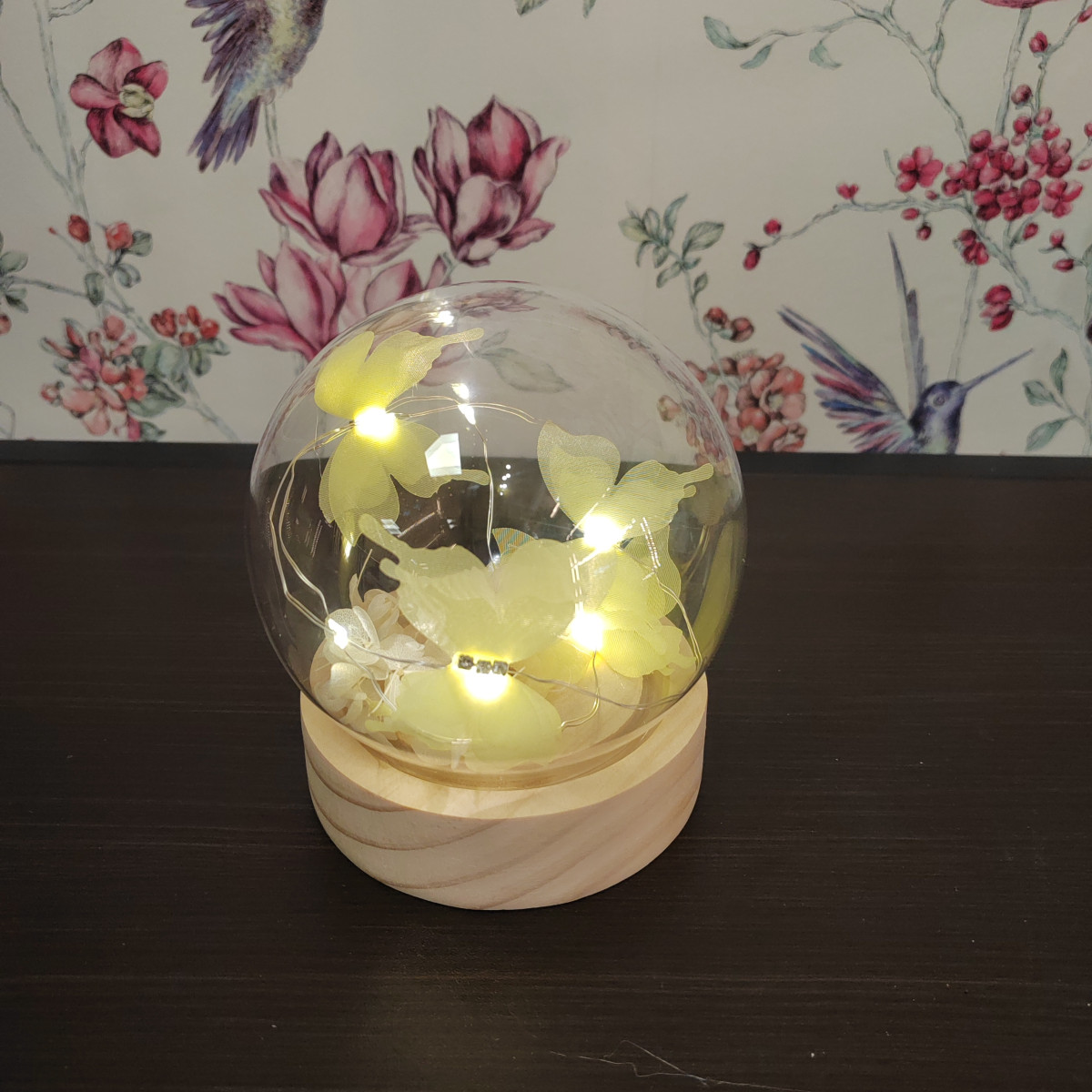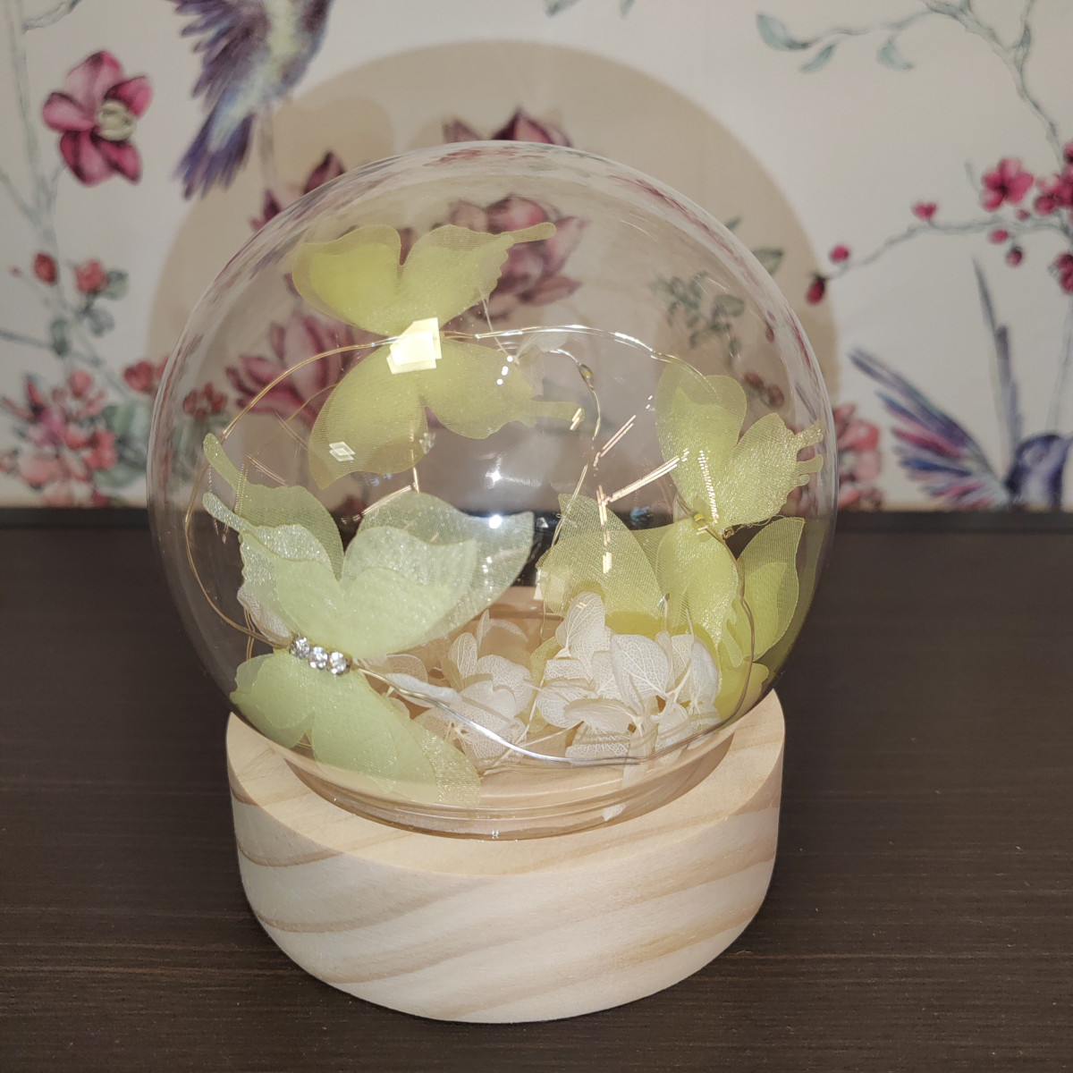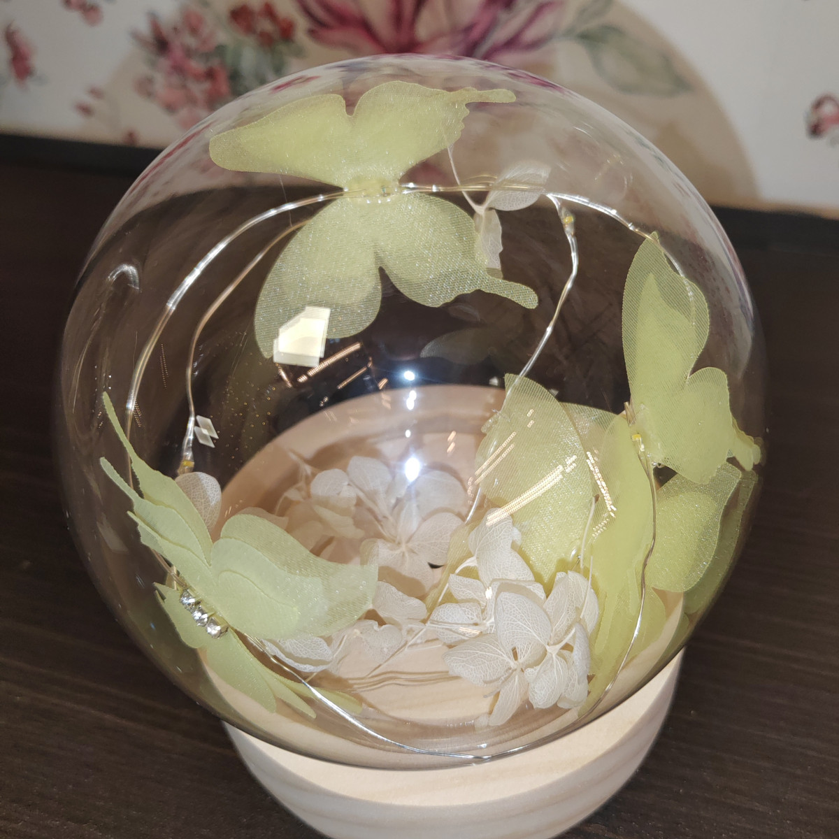 Sfera in vetro con led a batteria interni con all’interno farfalline in tessuto con brillantini e ortensie bianche.