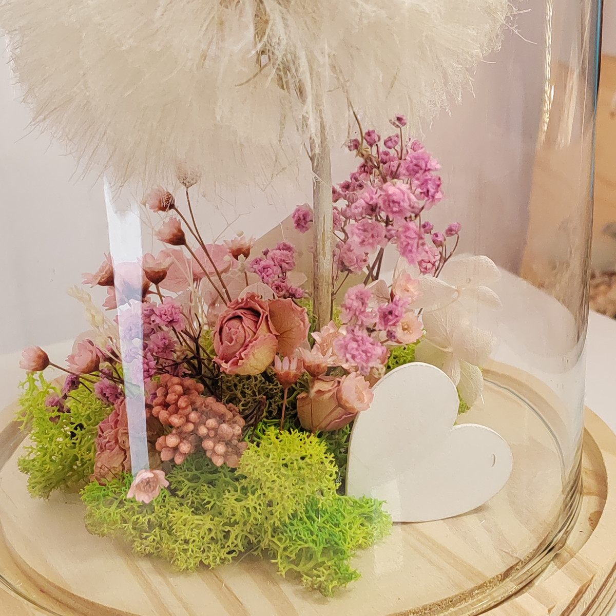 Composizione in campana di vetro con soffione stabilizzato e altri fiori stabilizzati bianchi e rosa.