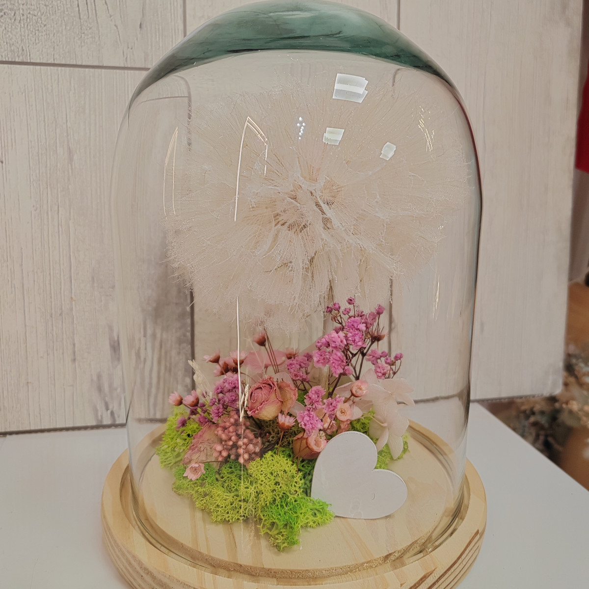 Composizione in campana di vetro con soffione stabilizzato e altri fiori stabilizzati bianchi e celesti.
