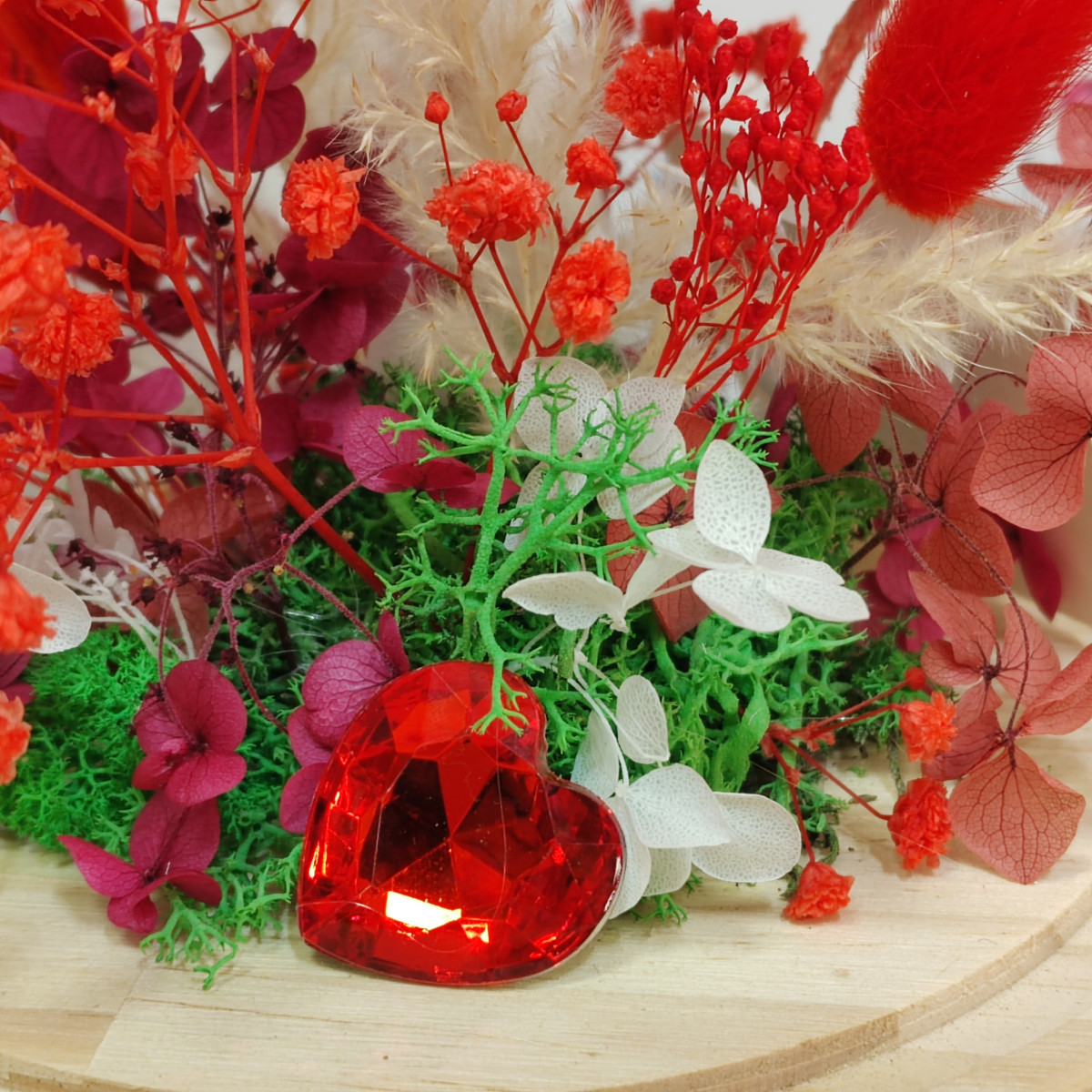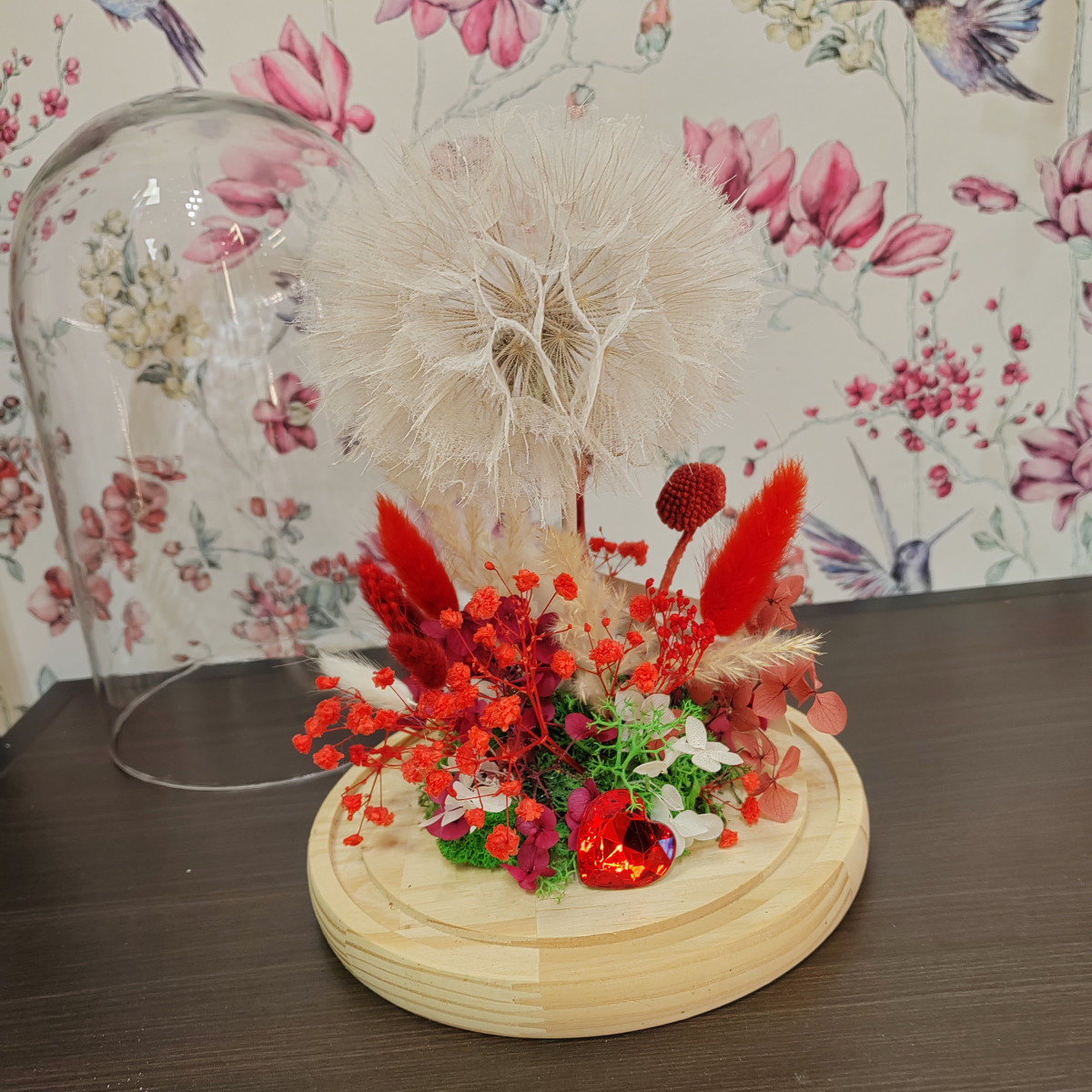 Composizione in campana di vetro con soffione stabilizzato e altri fiori stabilizzati bianchi rossi e rosa e una gemma a forma di cuore .