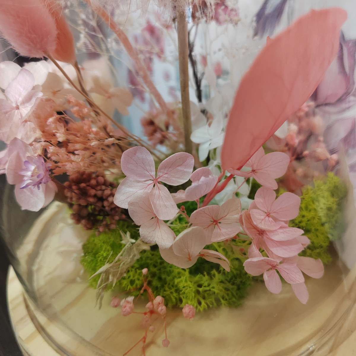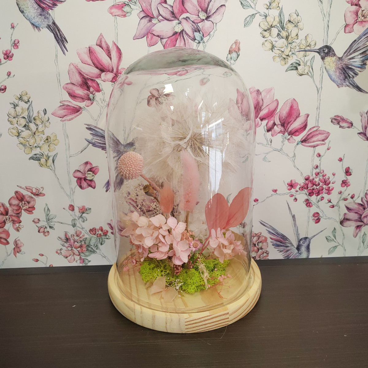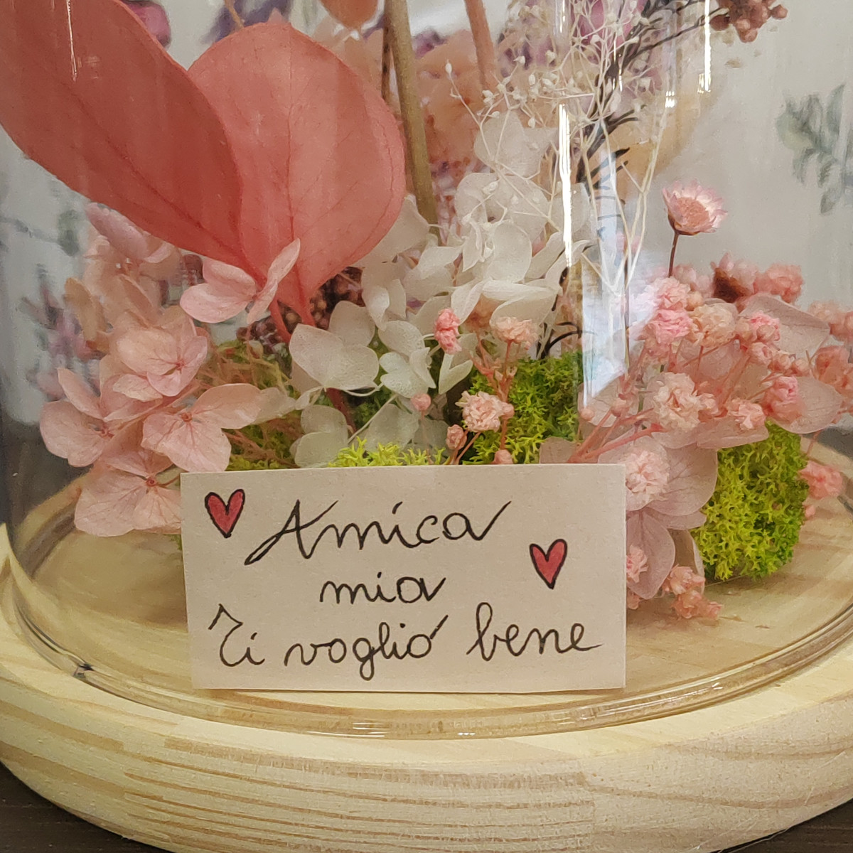 Composizione in campana di vetro con soffione stabilizzato e altri fiori stabilizzati bianchi rossi e rosa e una gemma a forma di cuore .