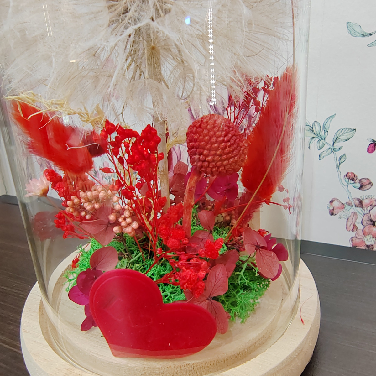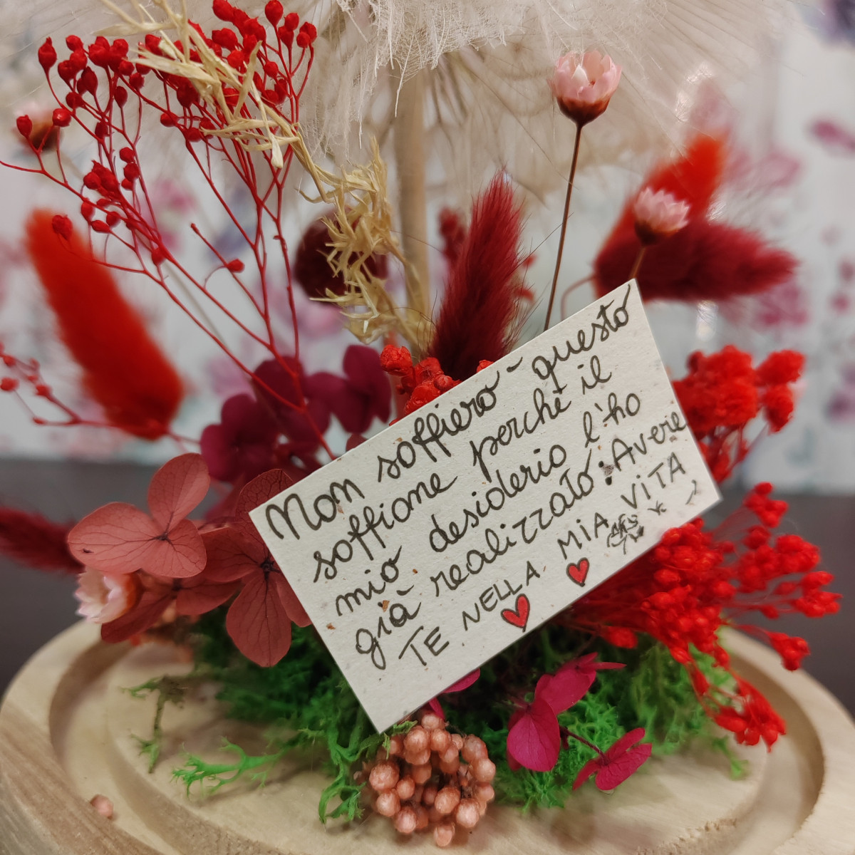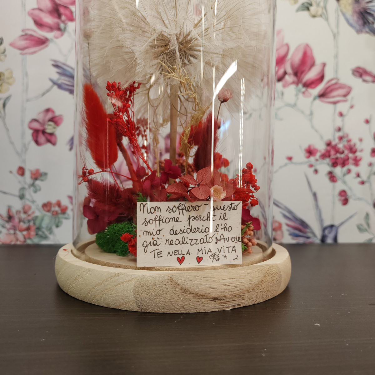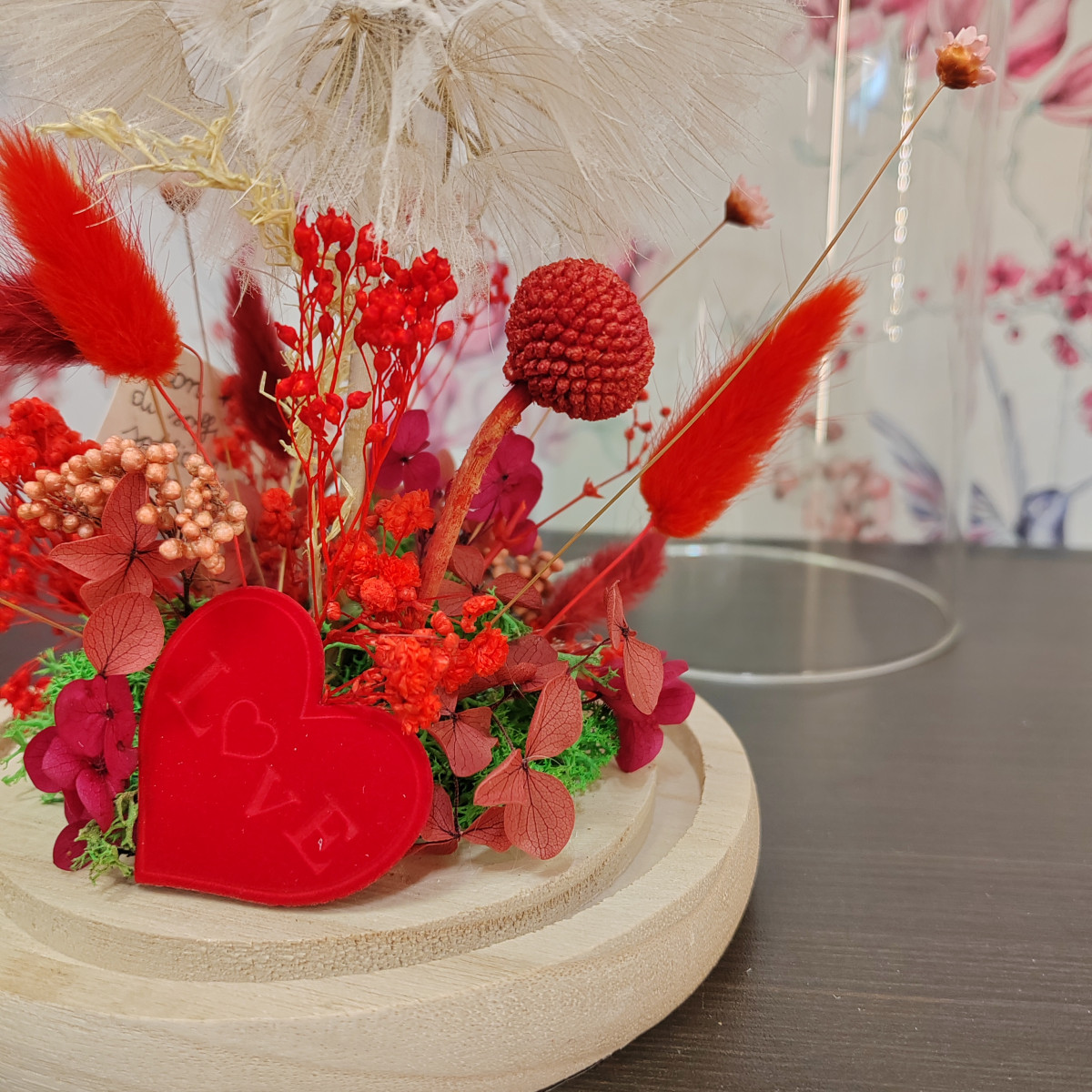 Composizione in campana di vetro con soffione stabilizzato e altri fiori stabilizzati bianchi rossi e rosa e cuore in velluto con scritta love.
