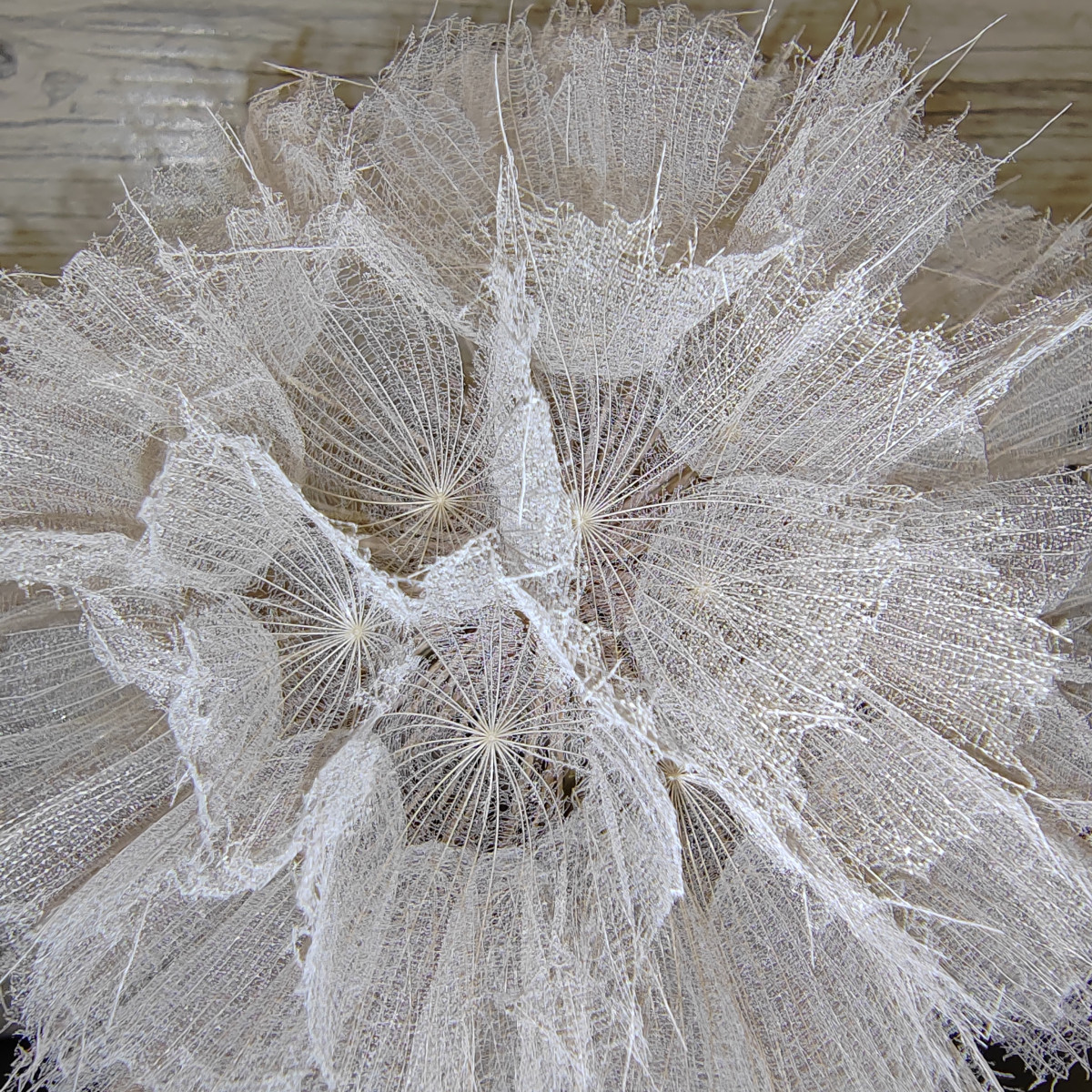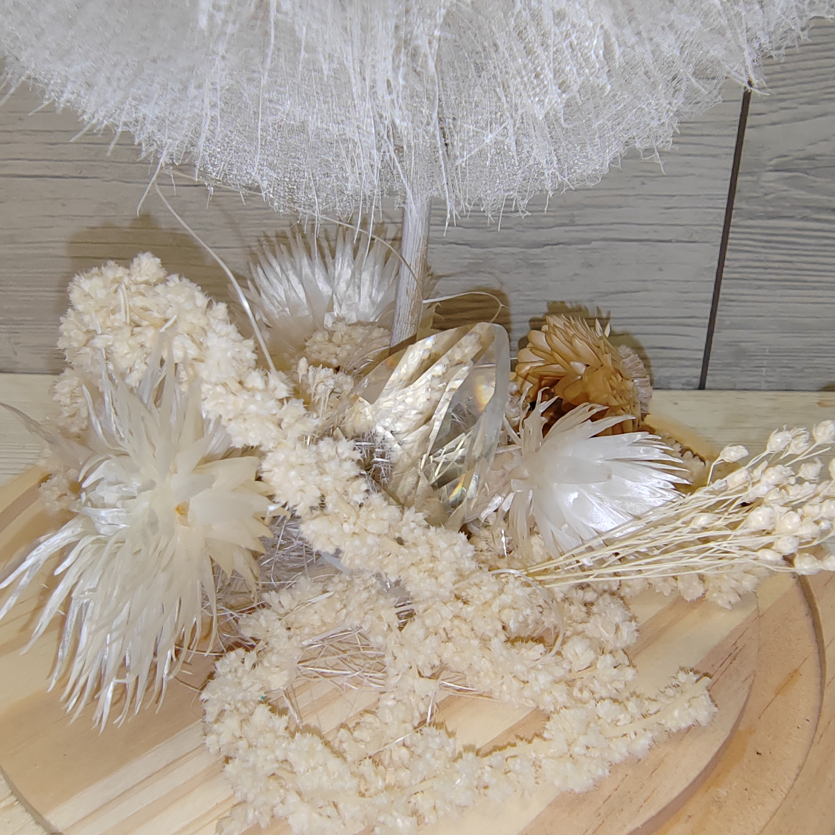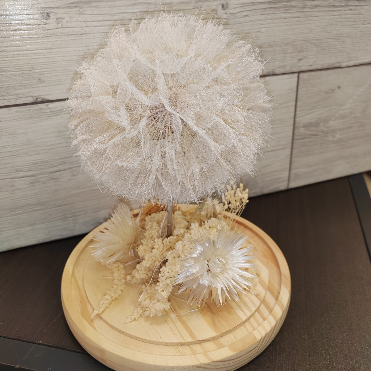 Composizione in campana di vetro con soffione stabilizzato e altri fiori stabilizzati e cristallo sfaccettato. La campana ha dimensioni : base diametro 15 cm, altezza 20 cm