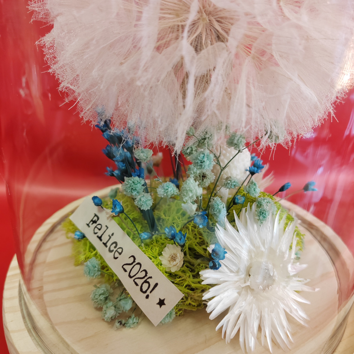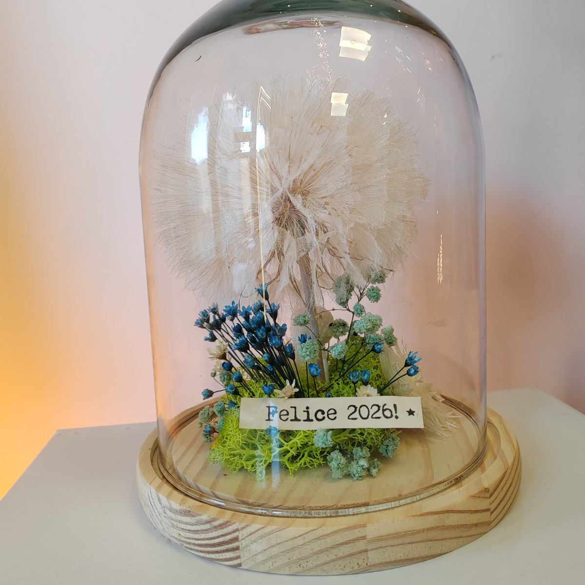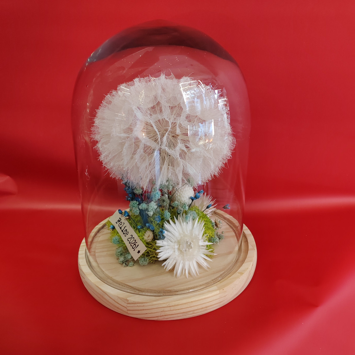 Composizione in campana di vetro con soffione stabilizzato e altri fiori stabilizzati bianchi e celesti.