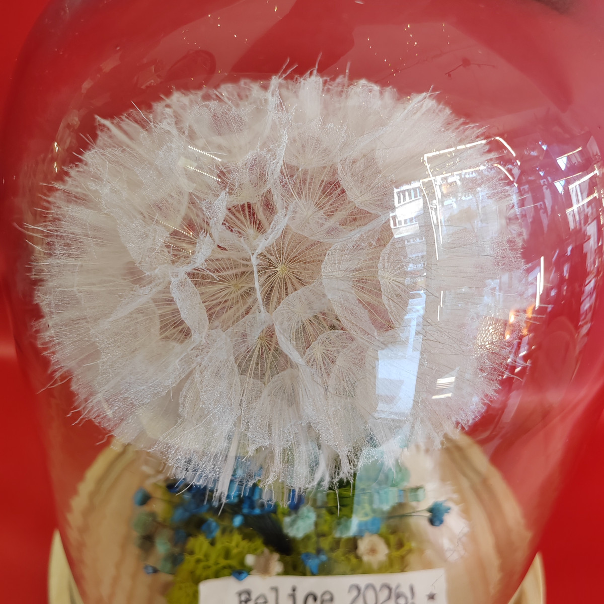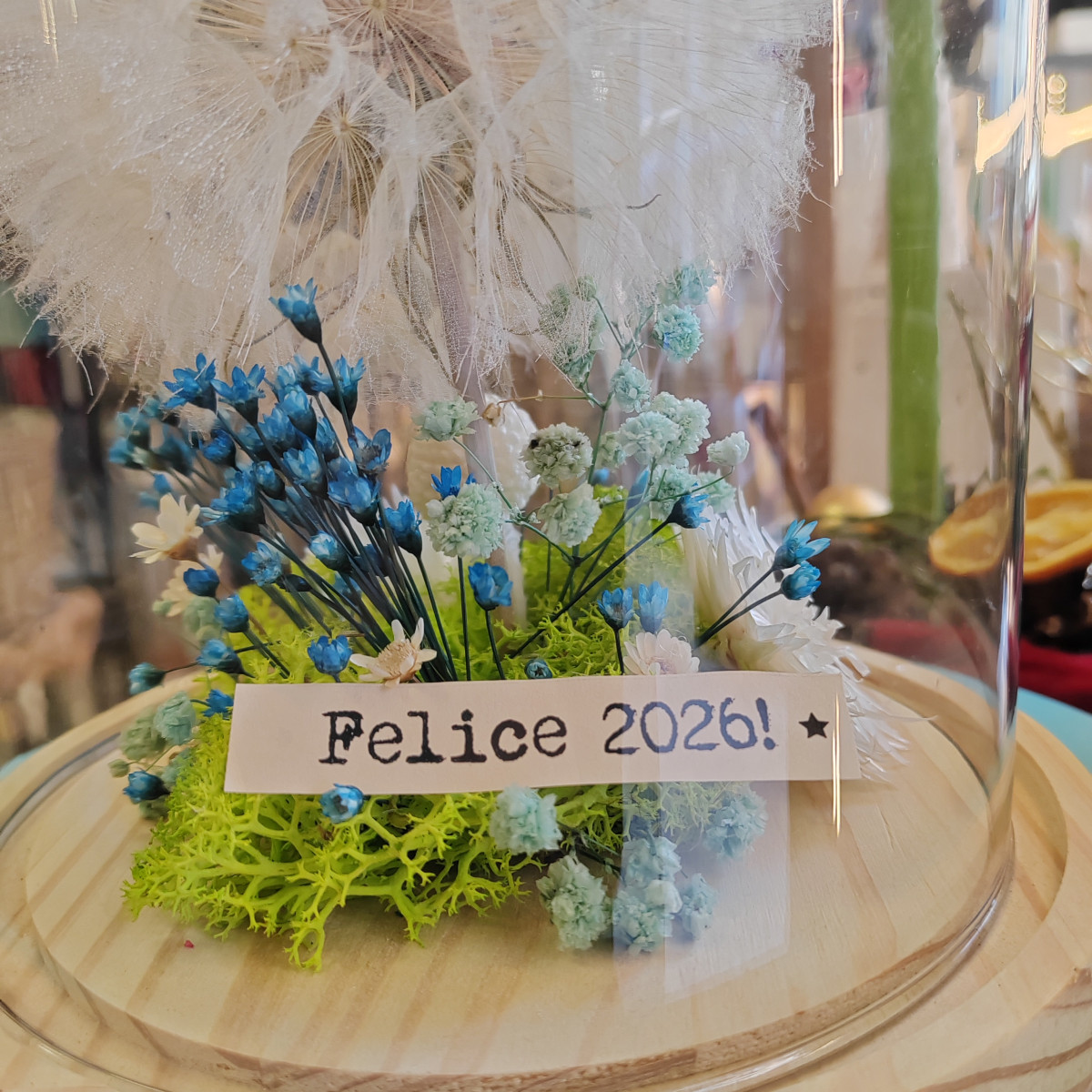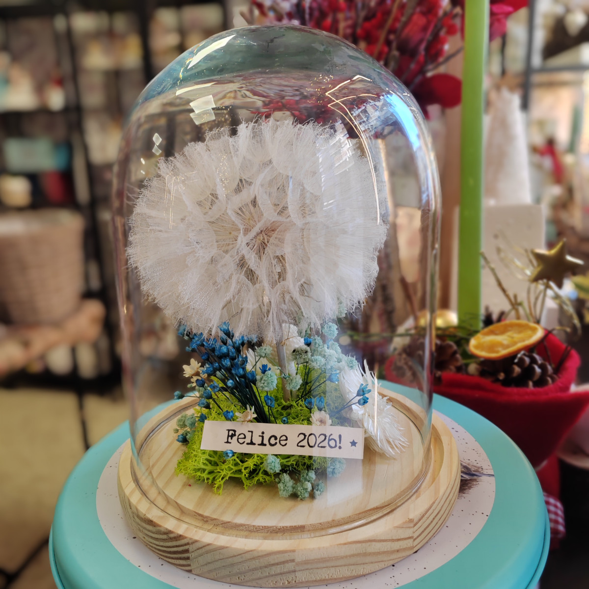Composizione in campana di vetro con soffione stabilizzato e altri fiori stabilizzati bianchi e celesti.