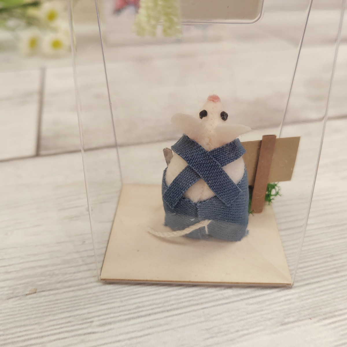 Topino in tessuto ed elementi decorativi, arricchito con messaggio e blister regalo.