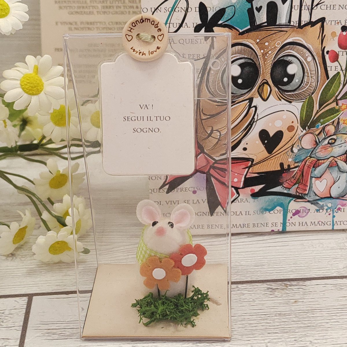 Un'azienda artigianale specializzata nella creazione di articoli da regalo unici e fatti a mano. Simpatici personaggi come gufetti, ricci, gnomi e topini di stoffa, ciascuno in una confezione trasparente accompagnato da un messaggio speciale.
