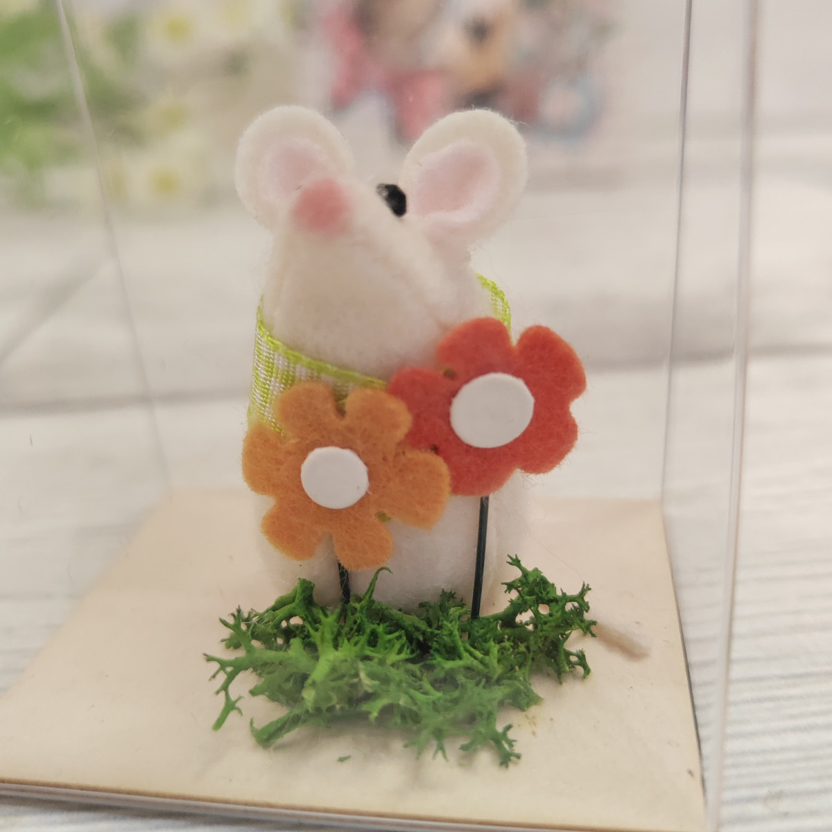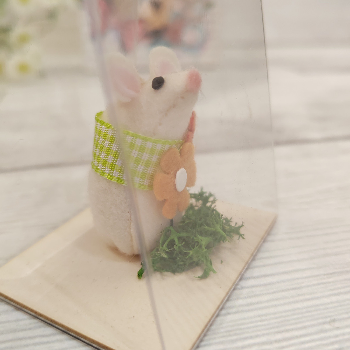 Topino in tessuto ed elementi decorativi, arricchito con messaggio e blister regalo.