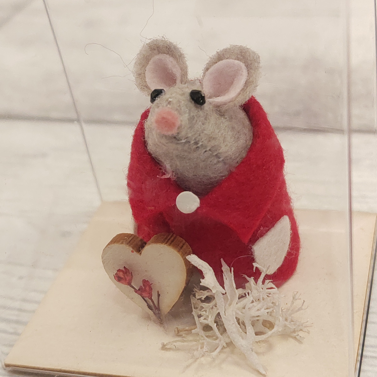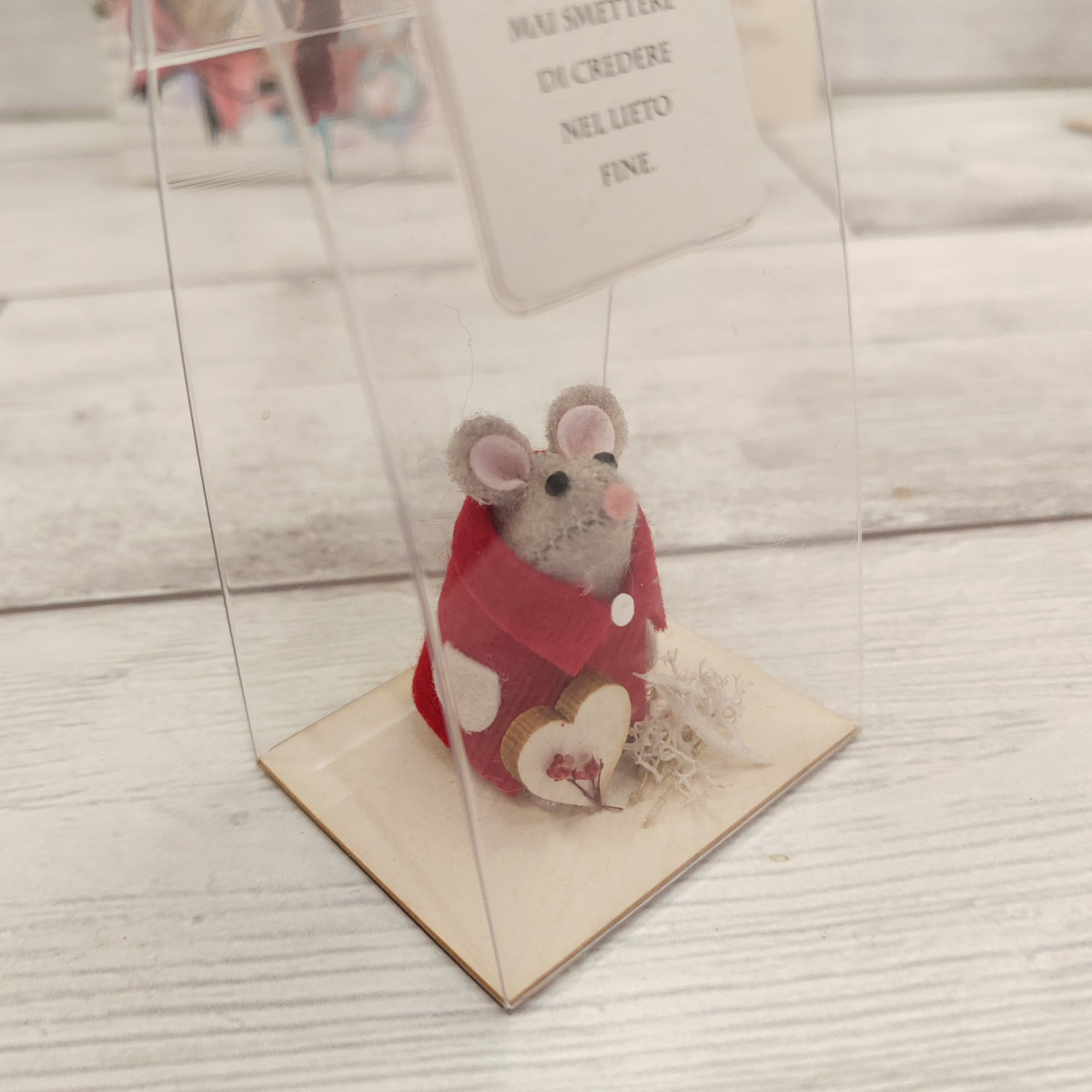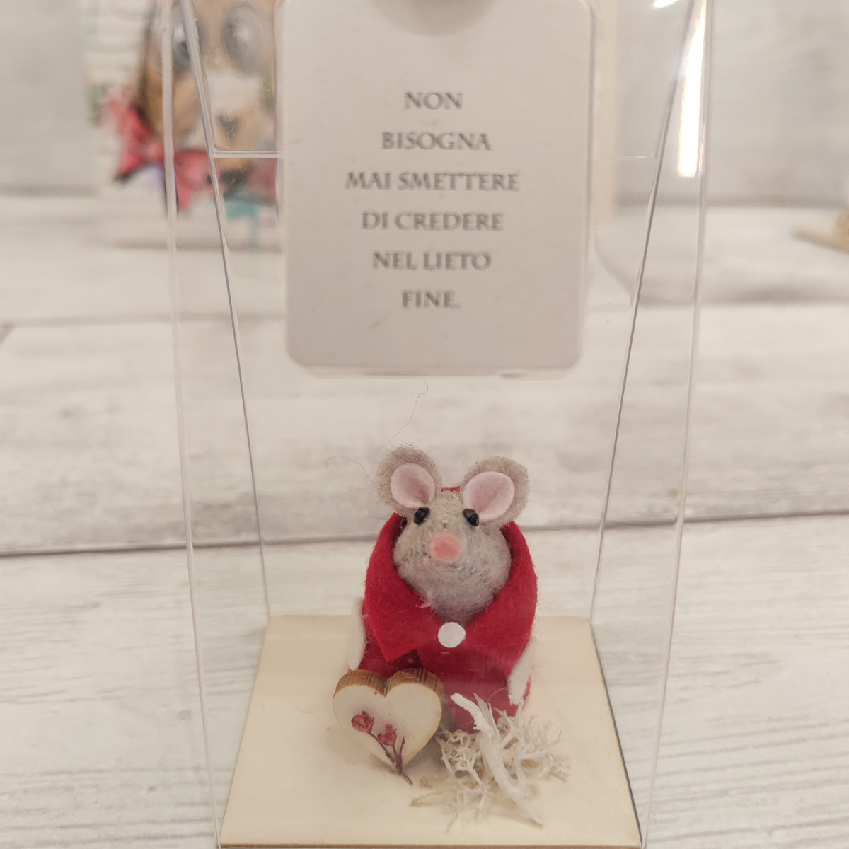 Topino in tessuto ed elementi decorativi, arricchito con messaggio e blister regalo.