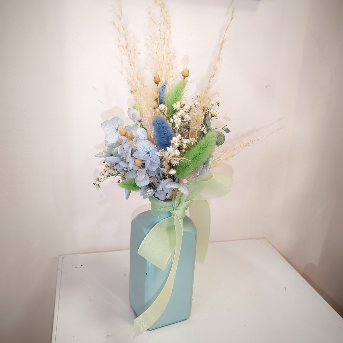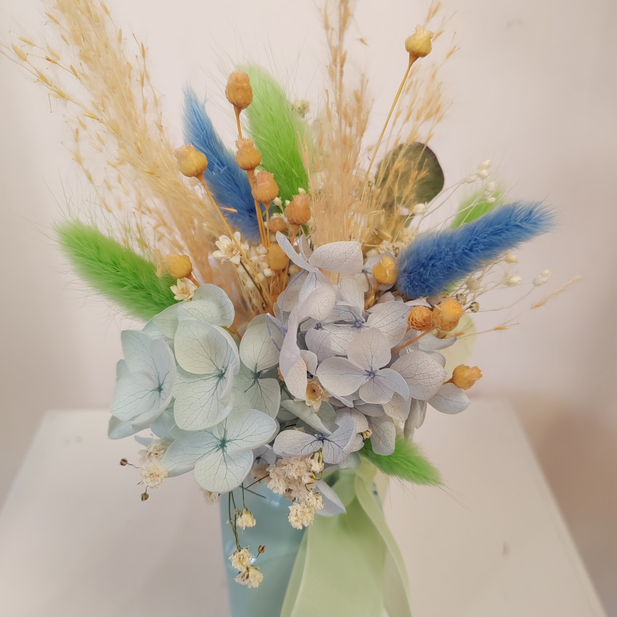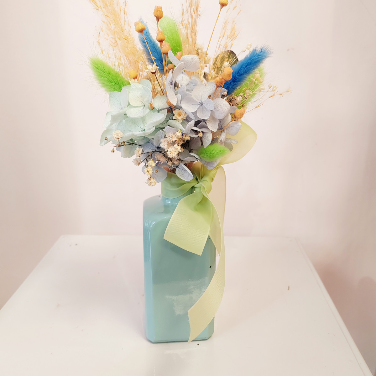 Composizione in vasetto in vetro color carta da zucchero con fiori stabilizzati tra cui ortensie, gypsophila, lagurus,amaranthus, capsule di papavero